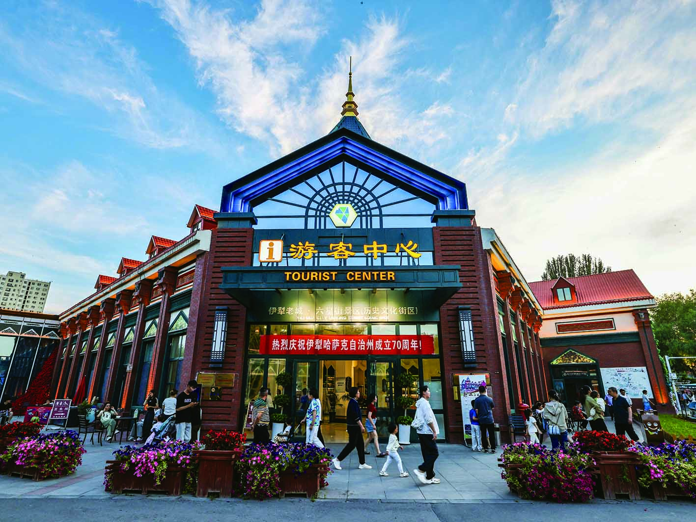 傍晚,伊寧市六星街景區(qū)游客中心門前,人來人往,熱鬧非凡。張慶華/攝