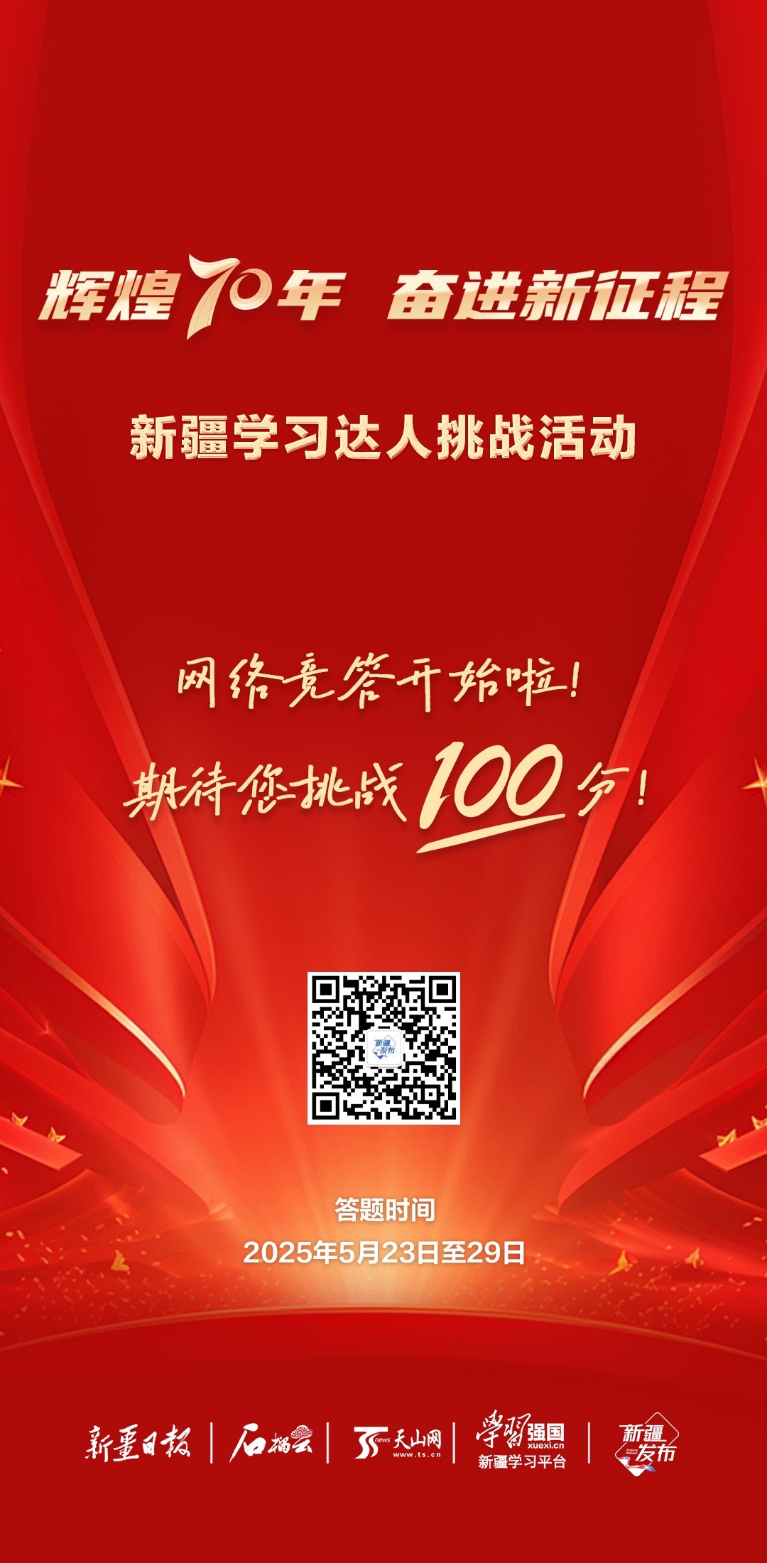 5月23日,“輝煌70年 奮進(jìn)新征程”新疆學(xué)習(xí)達(dá)人挑戰(zhàn)活動(dòng)正式啟動(dòng)。今年是新疆維吾爾自治區(qū)成立70周年,活動(dòng)誠(chéng)邀全疆各族干部群眾踴躍參與,開(kāi)啟學(xué)習(xí)與挑戰(zhàn)之旅。