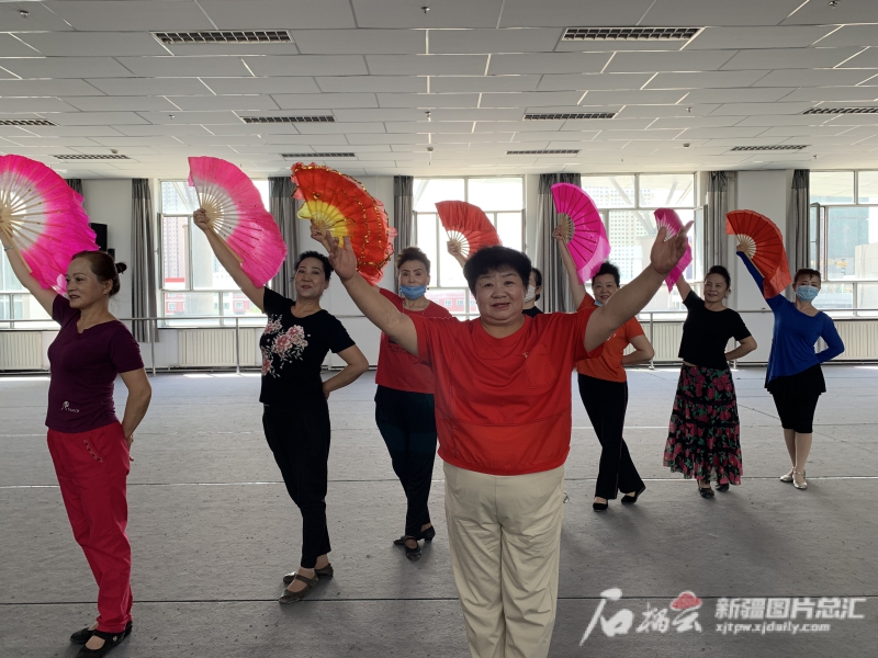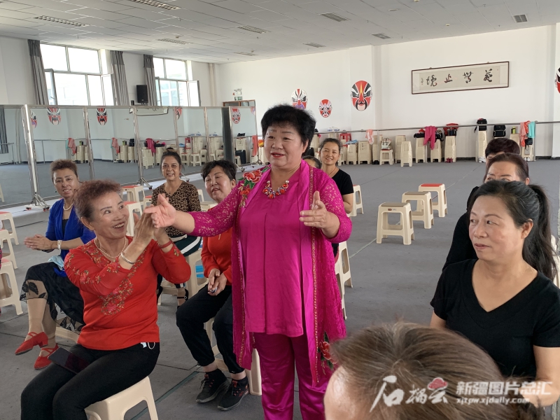 6月7日,王秀芳在舞蹈隊(duì)員伴舞下,一起排練“新疆花兒”。 天山網(wǎng)-新疆日?qǐng)?bào)記者張小宓攝