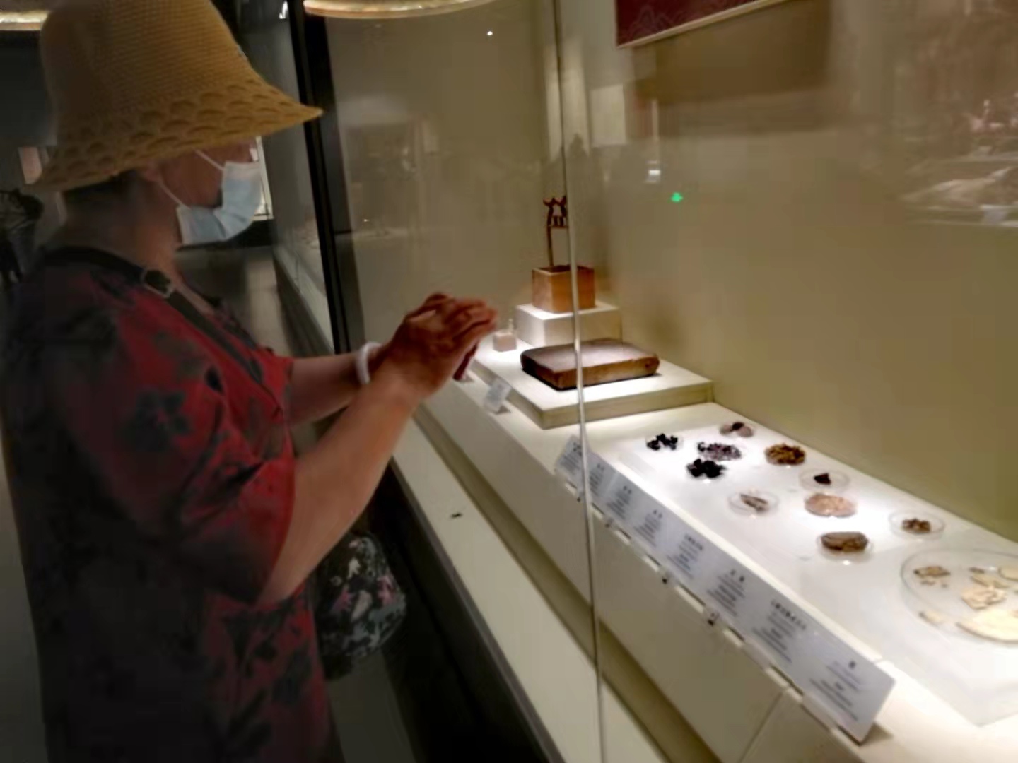 在新疆博物館一樓展廳,觀眾在寶相花紋月餅櫥窗前參觀。天山網(wǎng)-新疆日報(bào)記者賈春霞攝