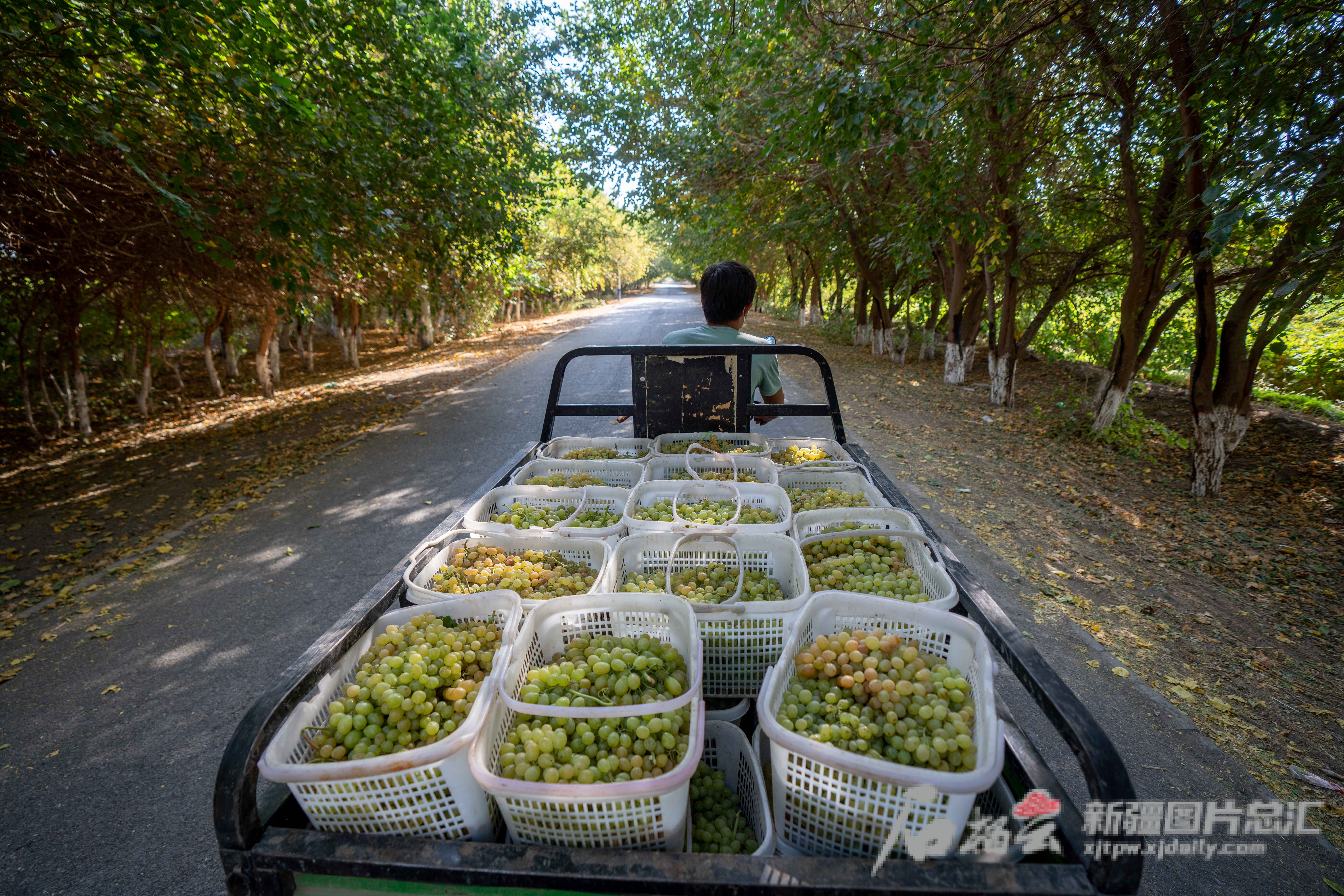 9月25日,吐魯番市高昌區(qū)恰特喀勒鄉(xiāng)奧依曼坎爾孜村,村民正在運(yùn)送葡萄。目前,當(dāng)?shù)仄咸巡烧呀咏猜暋?0月中下旬,制干葡萄開始陸續(xù)上市銷售。天山網(wǎng)-新疆日報(bào)記者 呂伊晗 攝