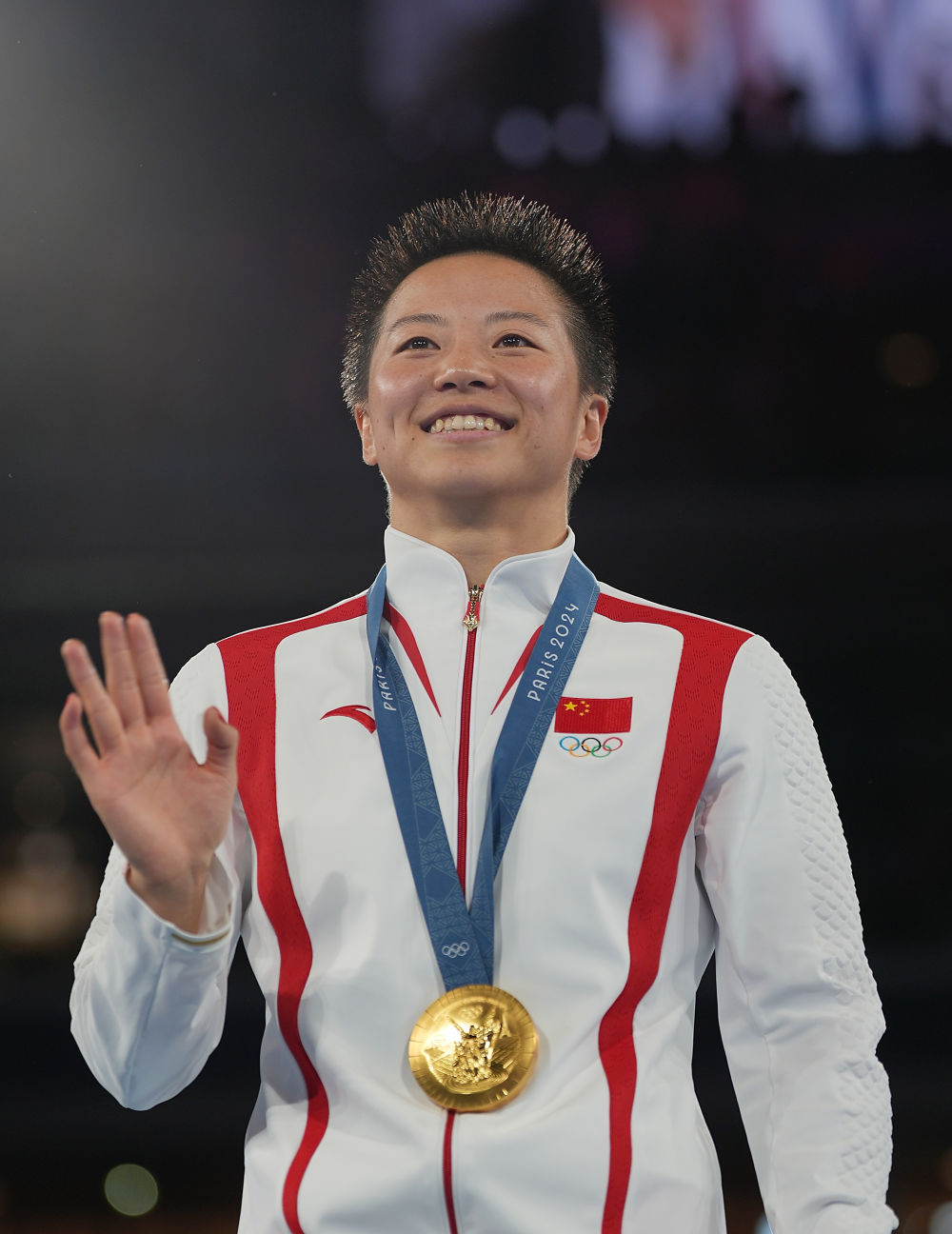 圖為吳愉在巴黎奧運會拳擊項目女子50公斤級頒獎儀式上慶祝。新華社記者 江文耀 攝