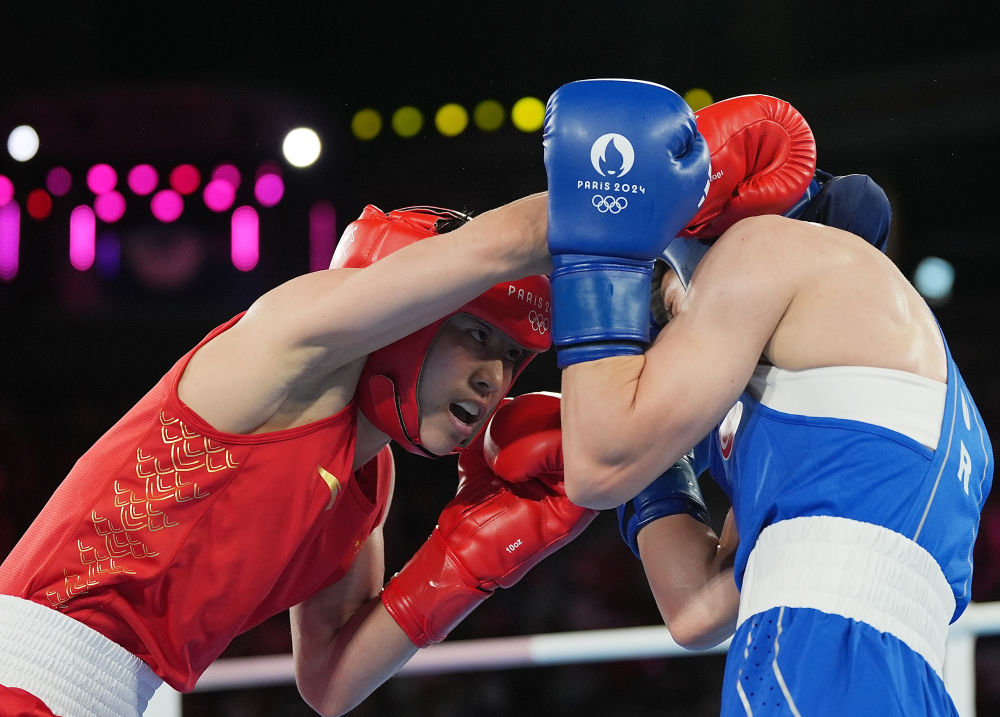 圖為在巴黎奧運會拳擊項目女子50公斤級決賽中,吳愉(左)對陣土耳其選手恰克爾奧盧。新華社記者 江文耀 攝