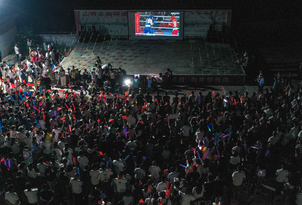 吳愉家鄉(xiāng)的人們在觀看吳愉對陣土耳其選手恰克爾奧盧的電視直播(無人機照片)。新華社記者 楊文斌 攝