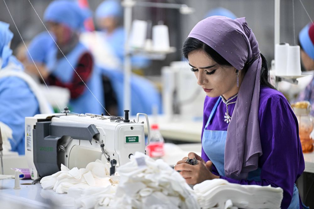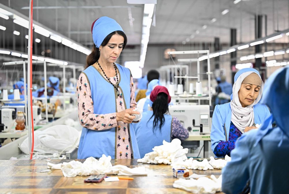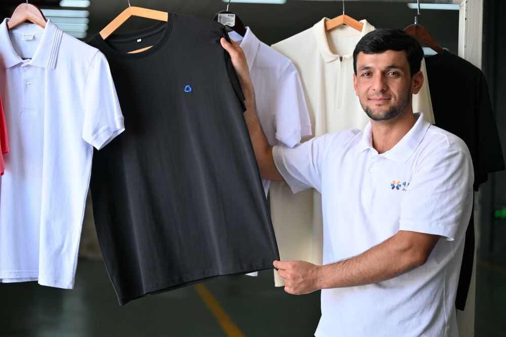 在塔吉克斯坦哈特隆州丹加拉區(qū)的中塔合作項(xiàng)目丹加拉農(nóng)業(yè)紡織產(chǎn)業(yè)園,塔方員工卡尤莫夫展示成衣樣品。