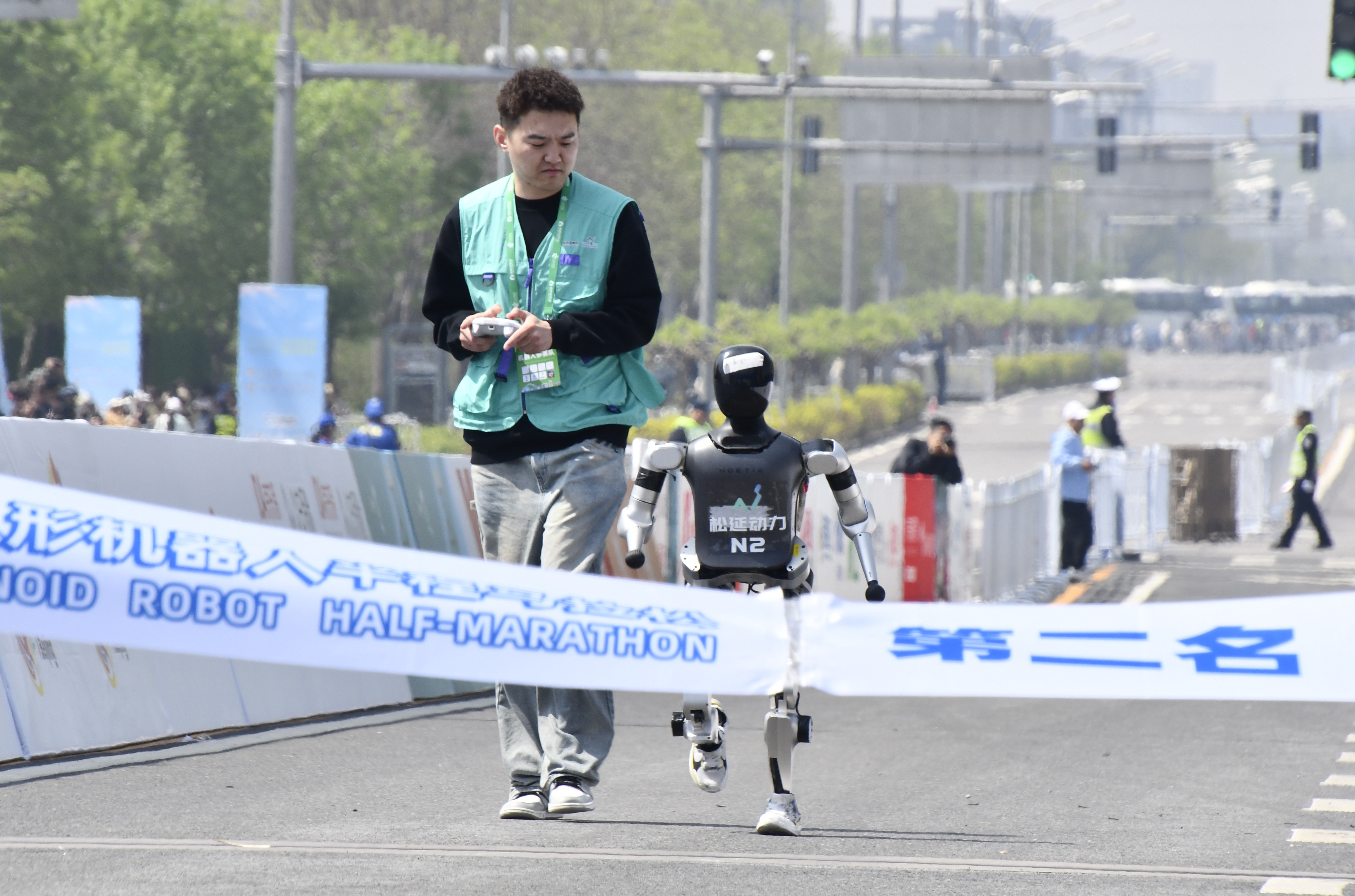 4月19日,在2025北京亦莊半程馬拉松暨人形機器人半程馬拉松比賽中,小頑童隊選手松延動力N2(右)沖向終點。新華社記者李欣 攝
