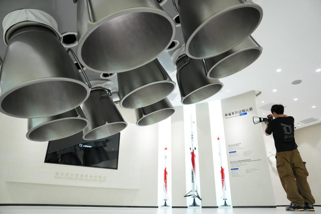 6月18日,一名記者在藍箭航天公司內(nèi)拍攝朱雀系列運載火箭的模型。新華社記者 鄭煥松 攝
