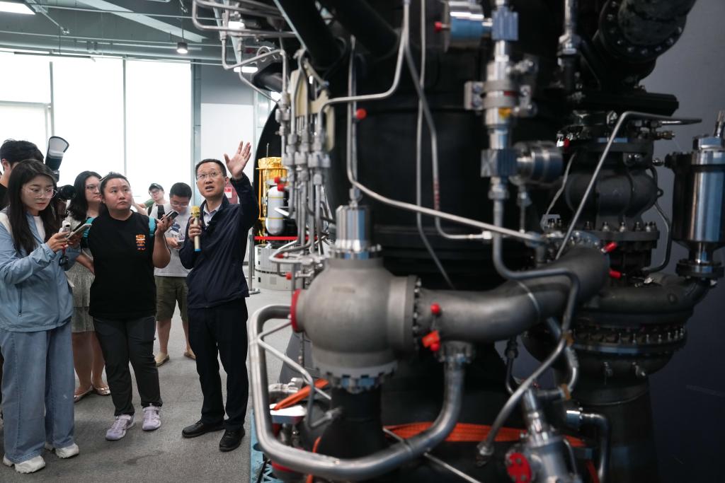 6月18日,星河動力執(zhí)行總裁夏東坤在北京經(jīng)濟技術(shù)開發(fā)區(qū)向媒體介紹智神星一號運載火箭發(fā)動機。新華社記者 鄭煥松 攝