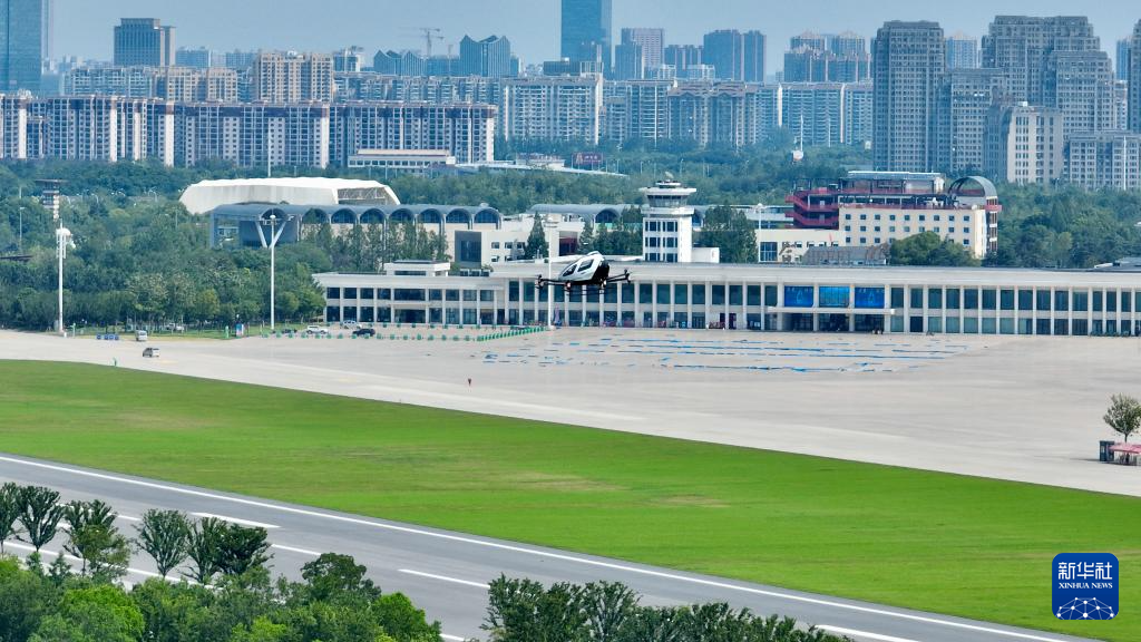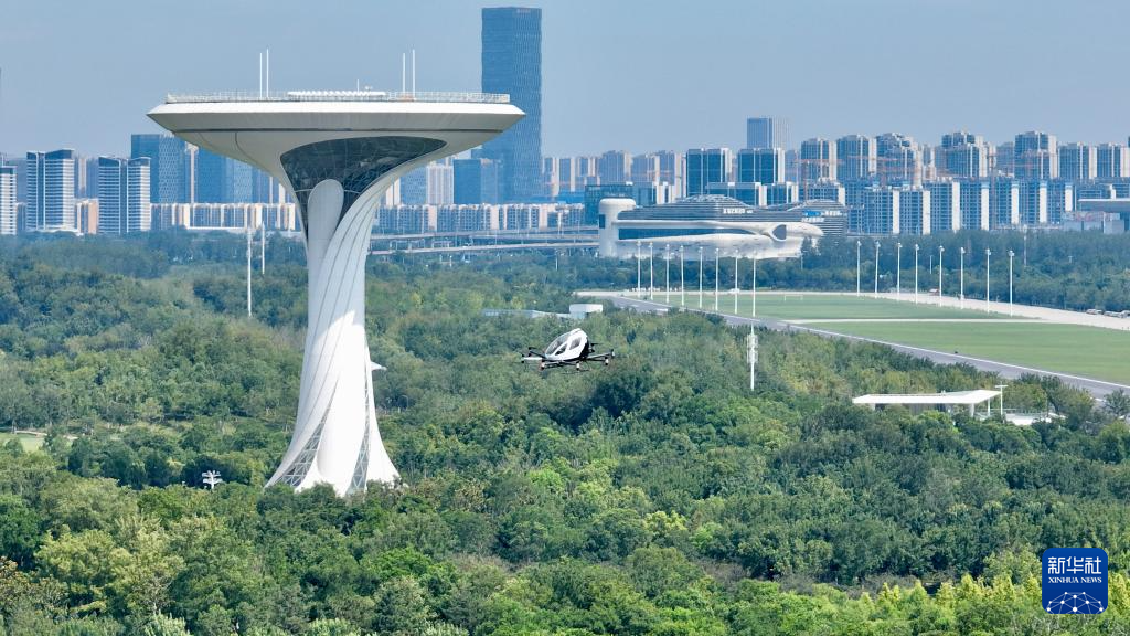 7月2日,一架電動(dòng)垂直起降飛行器(eVTOL)在合肥駱崗公園演示飛行(無人機(jī)照片)。新華社記者 周牧 攝