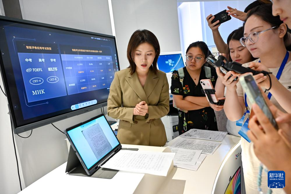 7月2日,一名工作人員在科大訊飛人工智能體驗(yàn)館介紹AI學(xué)習(xí)機(jī)的批改作業(yè)功能。新華社記者 張鋮 攝