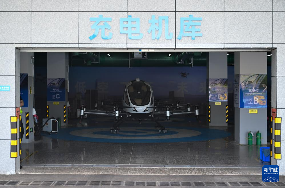 7月2日,在合肥駱崗公園,一架電動(dòng)垂直起降飛行器(eVTOL)停放在充電機(jī)庫(kù)中。新華社記者 周牧 攝