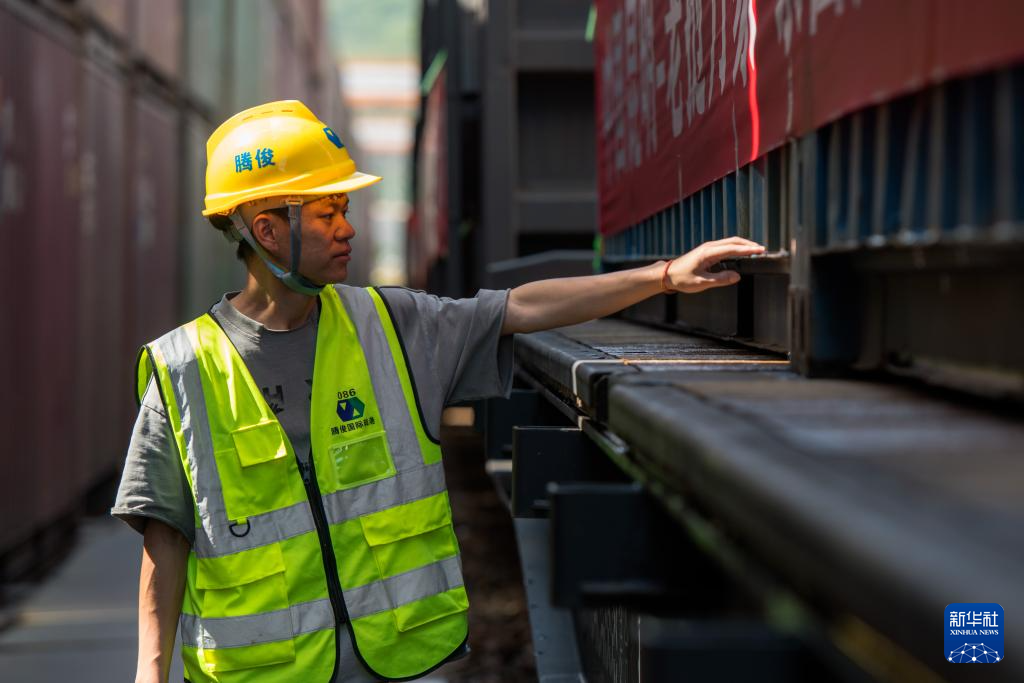 7月4日,工人在發(fā)車前對(duì)“鄭和號(hào)”海公鐵國際多式聯(lián)運(yùn)班列首發(fā)列車進(jìn)行檢查。新華社發(fā)(彭奕凱 攝)