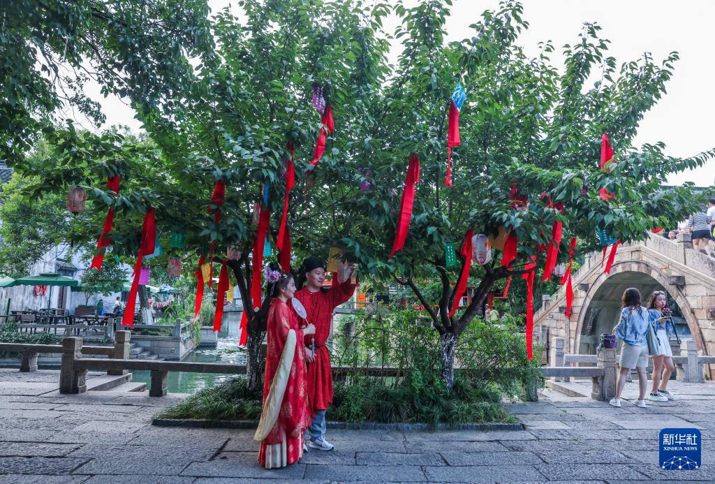 8月26日,在嘉興市南湖區(qū)月河歷史街區(qū),游客身著傳統(tǒng)服飾在七夕許愿樹下拍照。新華社記者 徐昱 攝