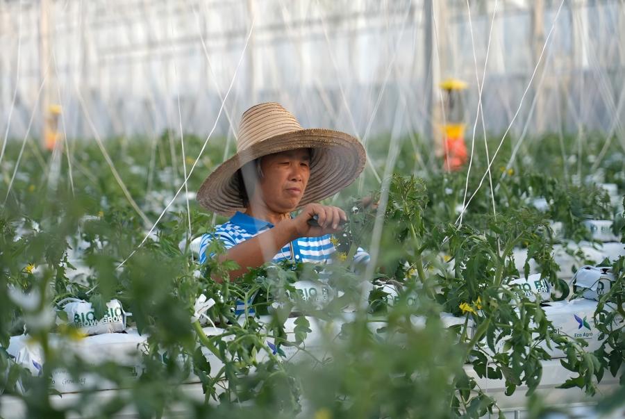 在江西省贛州市于都縣梓山鎮(zhèn)潭頭村的果蔬種植基地,村民給絲瓜整枝(2025年1月3日攝)。新華社發(fā)(劉小強(qiáng) 攝)
