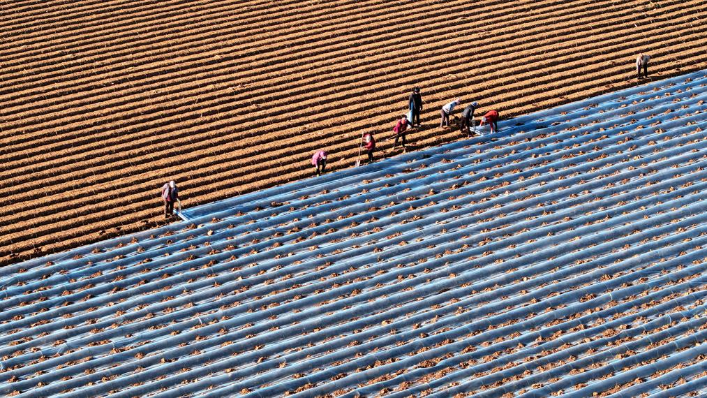 12月6日,在山東省臨沂市平邑縣臨澗鎮(zhèn),農(nóng)民為蔬菜幼苗覆蓋保溫薄膜(無人機照片)。新華社發(fā)(武紀(jì)全攝)