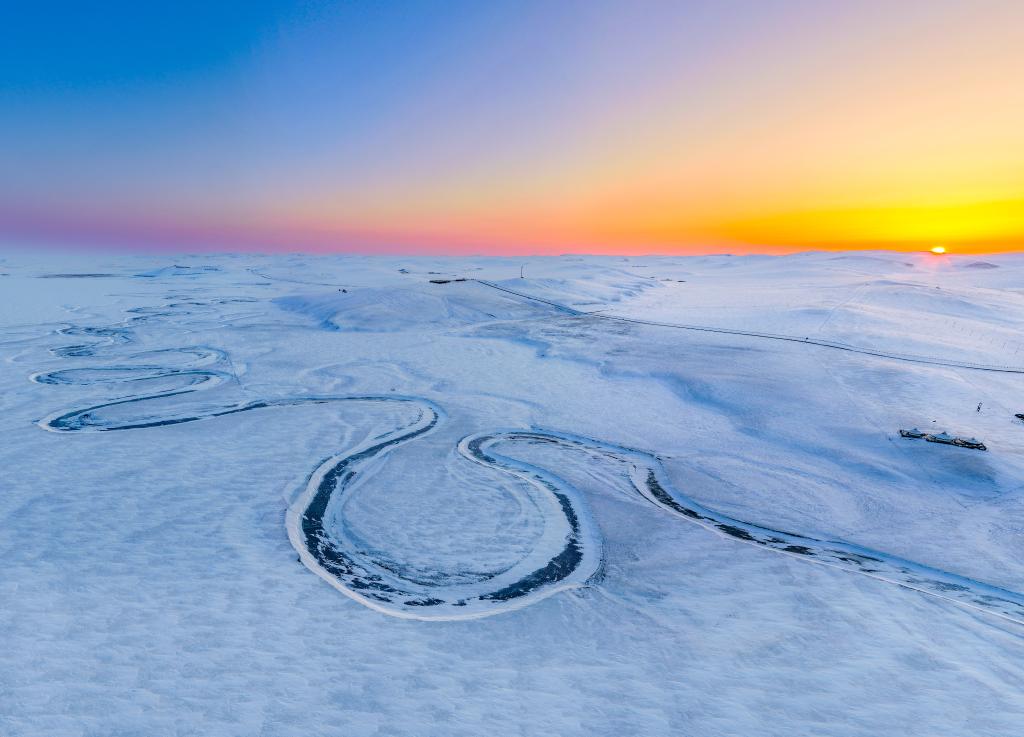 這是12月3日在內(nèi)蒙古呼倫貝爾市陳巴爾虎旗拍攝的呼倫貝爾大草原日出風(fēng)光(無人機照片)。新華社記者 馬金瑞 攝