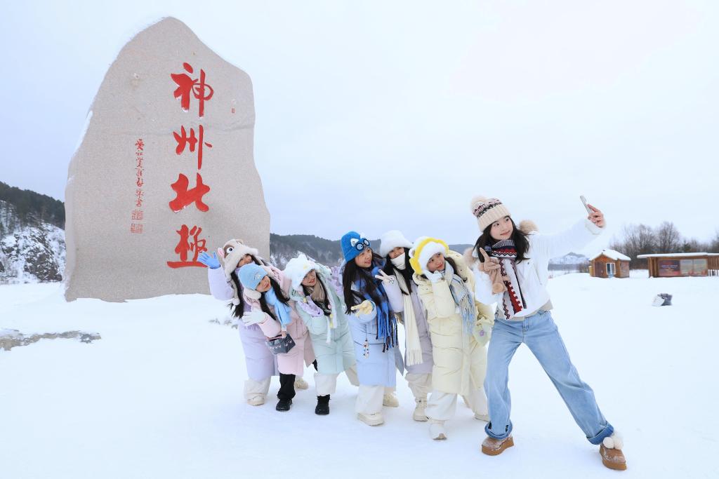 11月22日,游客在漠河北極村“神州北極”碑前打卡拍照。新華社發(fā)(徐率攝)