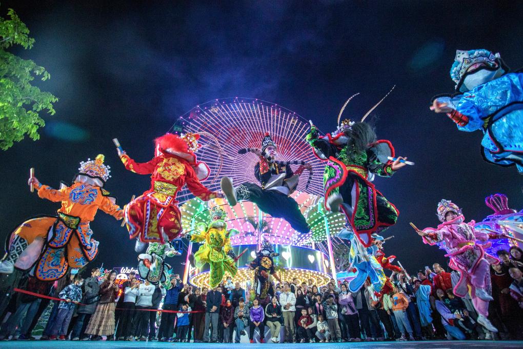 2026年2月19日,英歌舞隊(duì)在廣東省佛山市高明區(qū)濱荷Park生態(tài)文創(chuàng)園街頭巡游表演。