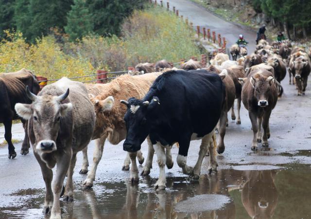 牧民趕褐牛走出山谷。新華社發(fā) (李文武 攝)