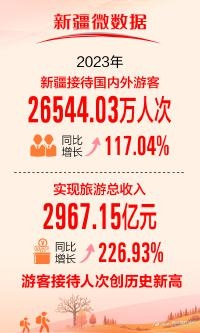 天山網(wǎng)-新疆日?qǐng)?bào)訊(記者任江 姚剛報(bào)道)1月9日,一組新疆旅游數(shù)據(jù)傳來(lái),據(jù)旅游統(tǒng)計(jì)大數(shù)據(jù)平臺(tái)和抽樣調(diào)查綜合測(cè)算:2023年度,新疆接待國(guó)內(nèi)外游客26544.03萬(wàn)人次,同比增長(zhǎng)117.04%;實(shí)現(xiàn)旅游總收入2967.15億元,同比增長(zhǎng)226.93%。其中,游客接待人次創(chuàng)歷史新高。