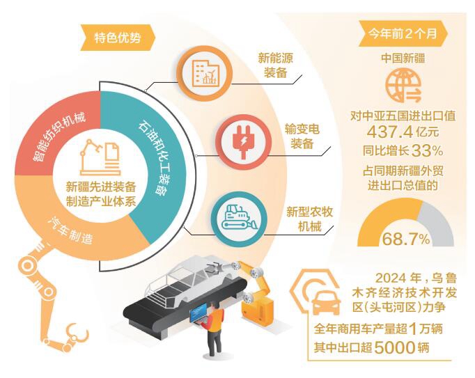 春風(fēng)送暖,新疆制造業(yè)迎來(lái)新機(jī)遇。當(dāng)前,新疆高端制造業(yè)企業(yè)正瞄準(zhǔn)海外市場(chǎng)揚(yáng)帆出海,一批疆外優(yōu)質(zhì)制造企業(yè)也在積極搶抓新疆“一帶一路”核心區(qū)建設(shè)帶來(lái)的重大機(jī)遇。中國(guó)新疆與中亞等周邊國(guó)家制造業(yè)雙向合作越來(lái)越緊密,制造業(yè)企業(yè)雙向奔赴的發(fā)展道路越走越寬廣。