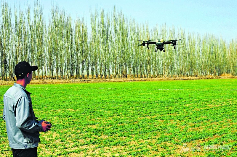 3月19日,在新疆生產(chǎn)建設(shè)兵團(tuán)二師22團(tuán)10連冬小麥地里,飛手操作植保無(wú)人機(jī)為冬小麥噴灑農(nóng)藥。眼下,該師種植的10.6萬(wàn)畝冬小麥長(zhǎng)勢(shì)良好,種植戶(hù)搶抓農(nóng)時(shí)為返青冬小麥追肥,確保今年糧食豐產(chǎn)增收。謝江林?jǐn)z