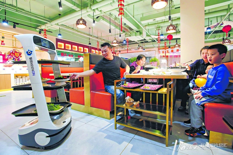 3月17日,位于烏魯木齊市水磨溝區(qū)溫泉西路的一家火鍋店,工作人員將菜品放在機(jī)器人的餐盤(pán)上,按下顧客所在桌號(hào),機(jī)器人就將飯菜送達(dá)指定餐桌:“您的菜品已送達(dá),請(qǐng)取餐。”天山網(wǎng)-新疆日?qǐng)?bào)記者蔡增樂(lè)攝