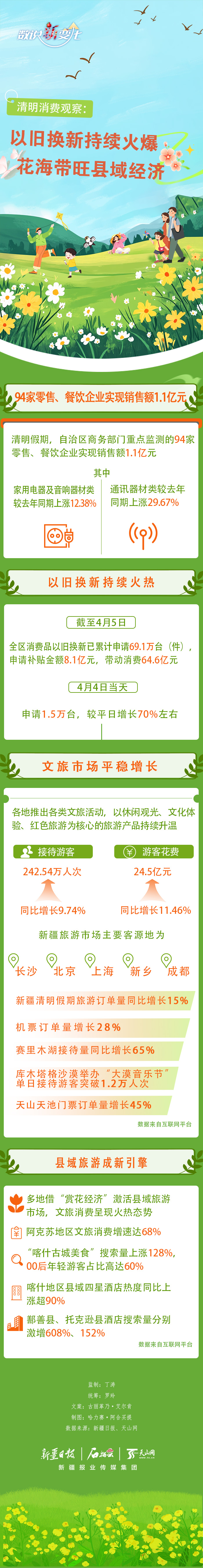 清明假期,新疆消費(fèi)市場(chǎng)運(yùn)行平穩(wěn)有序,各地大力實(shí)施提振消費(fèi)專(zhuān)項(xiàng)行動(dòng),創(chuàng)新多元化消費(fèi)場(chǎng)景,節(jié)日消費(fèi)市場(chǎng)持續(xù)活躍。消費(fèi)品以舊換新活動(dòng)熱度攀升,政策成效明顯。多地以花為媒,借“賞花經(jīng)濟(jì)”激活縣域旅游市場(chǎng),文旅消費(fèi)呈現(xiàn)火熱態(tài)勢(shì)。這個(gè)假期,新疆消費(fèi)市場(chǎng)都有哪些亮點(diǎn)?一圖了解。