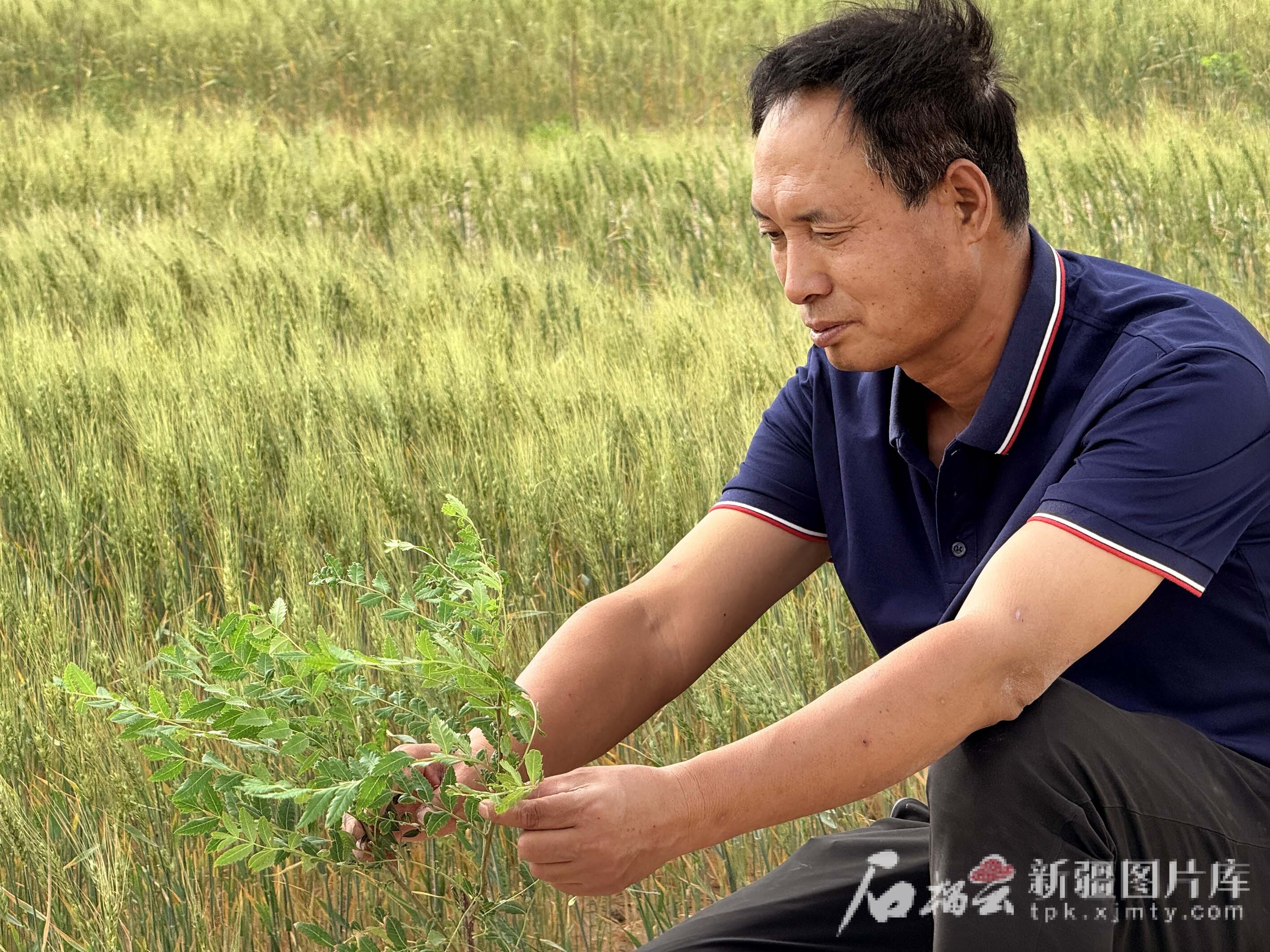 6月13日,且末縣老兵治沙隊(duì)創(chuàng)始人田來(lái)群在查看文冠果苗生長(zhǎng)情況。