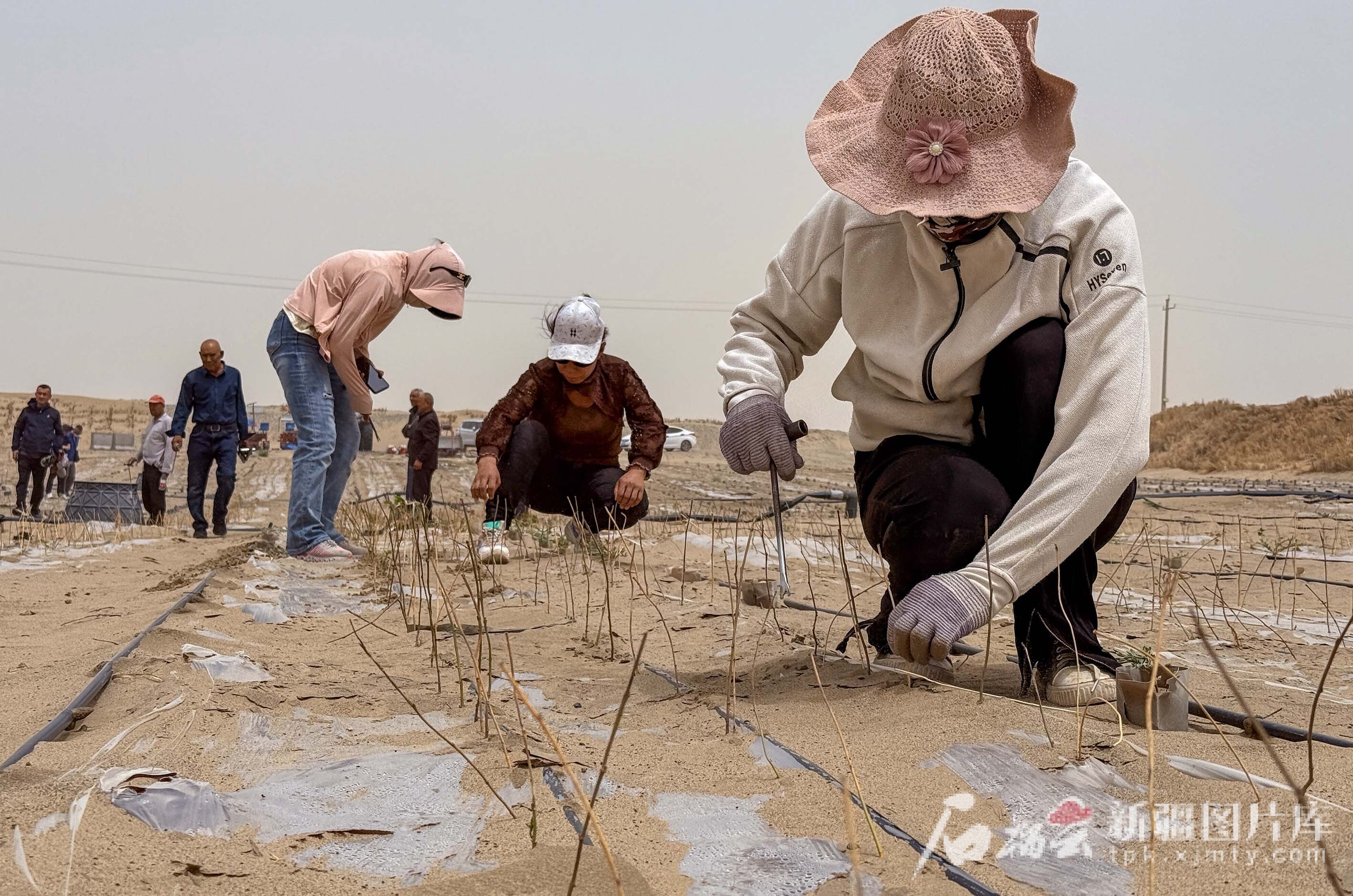 6月13日,在唐農(nóng)萬(wàn)物(且末)生態(tài)科技有限公司實(shí)驗(yàn)示范基地,工人在補(bǔ)植蛋白桑。