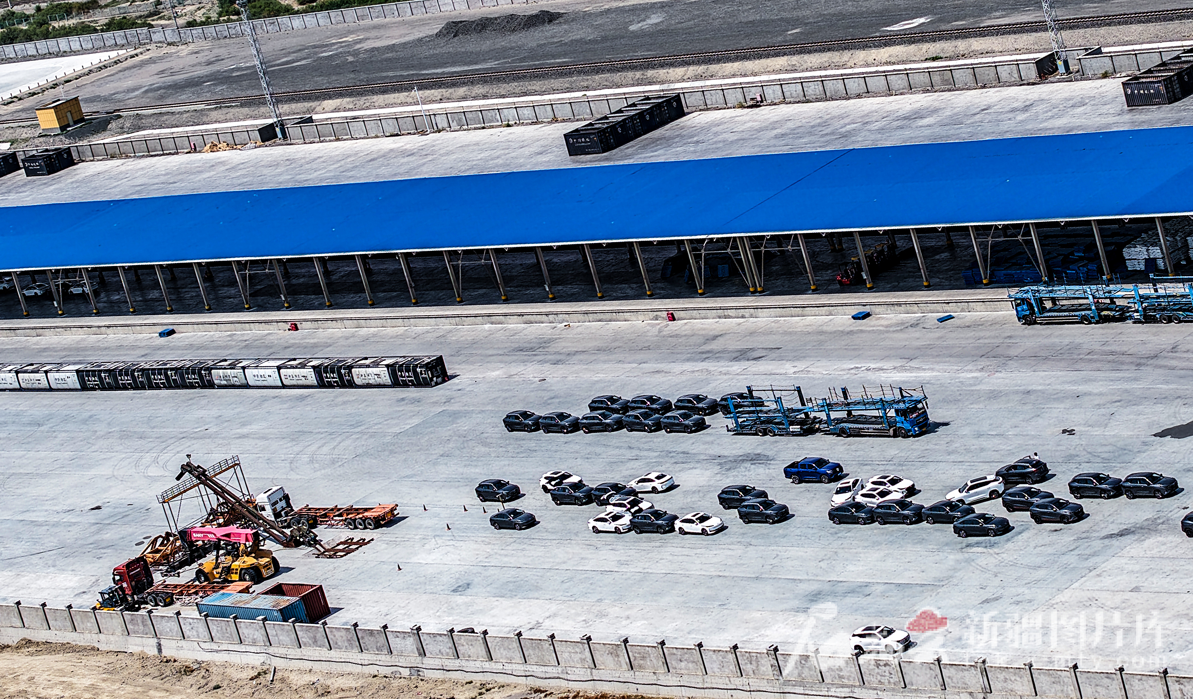 6月26日,在精河國際公鐵聯(lián)運綜合物流園,商品車輛準(zhǔn)備裝運上火車發(fā)往哈薩克斯坦。(無人機攝)