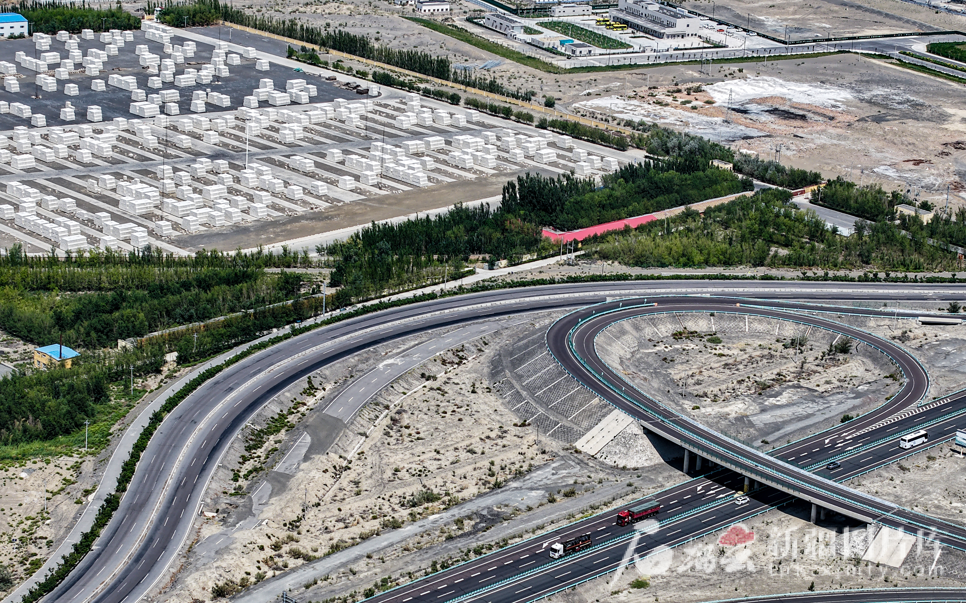 6月26日,連霍高速公路(G30)上的車輛駛過精河國際公鐵聯(lián)運綜合物流園。(無人機攝)