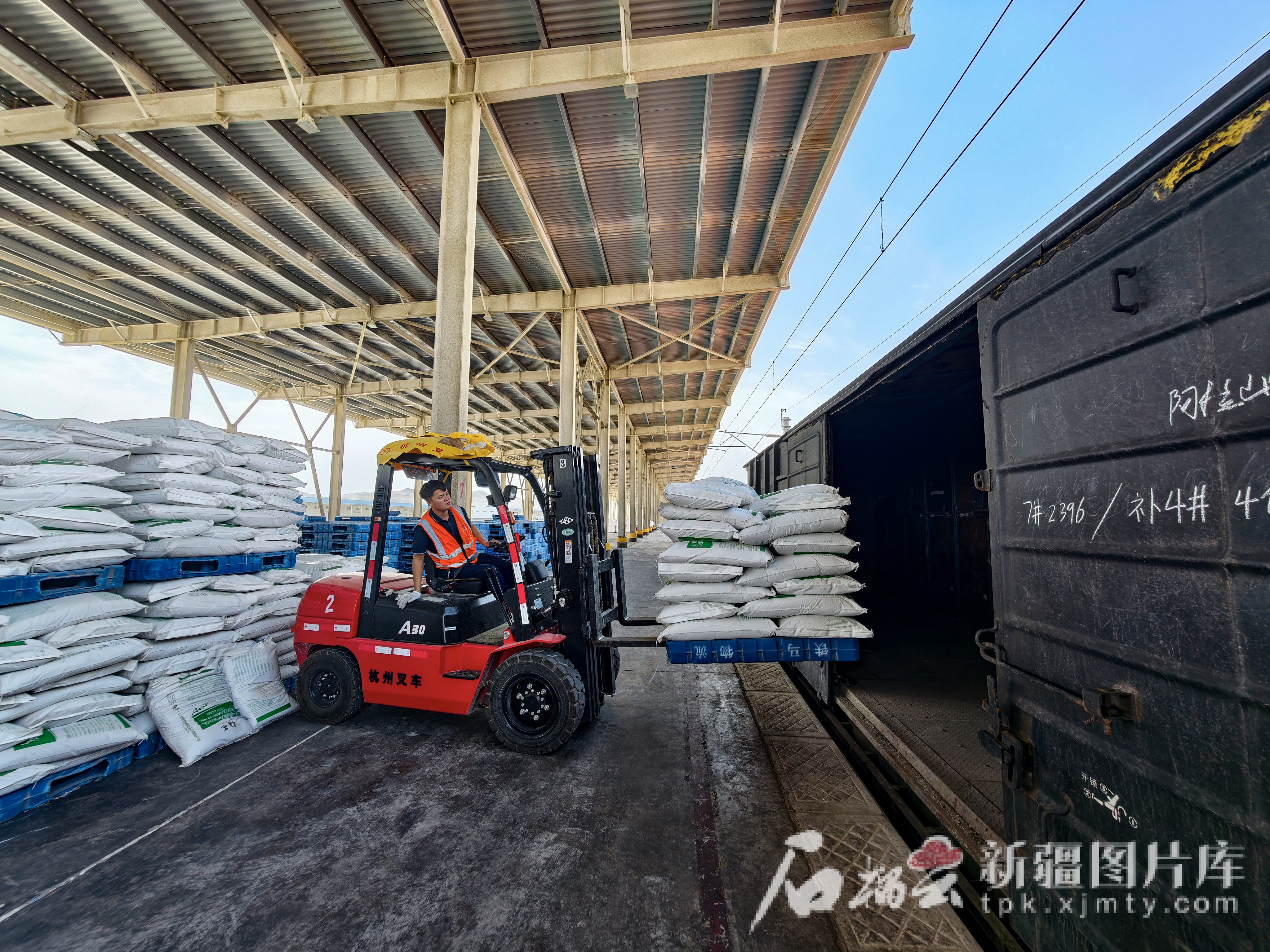 6月26日,在精河國際公鐵聯(lián)運綜合物流園,工作人員將即將出口的貨物裝上火車。