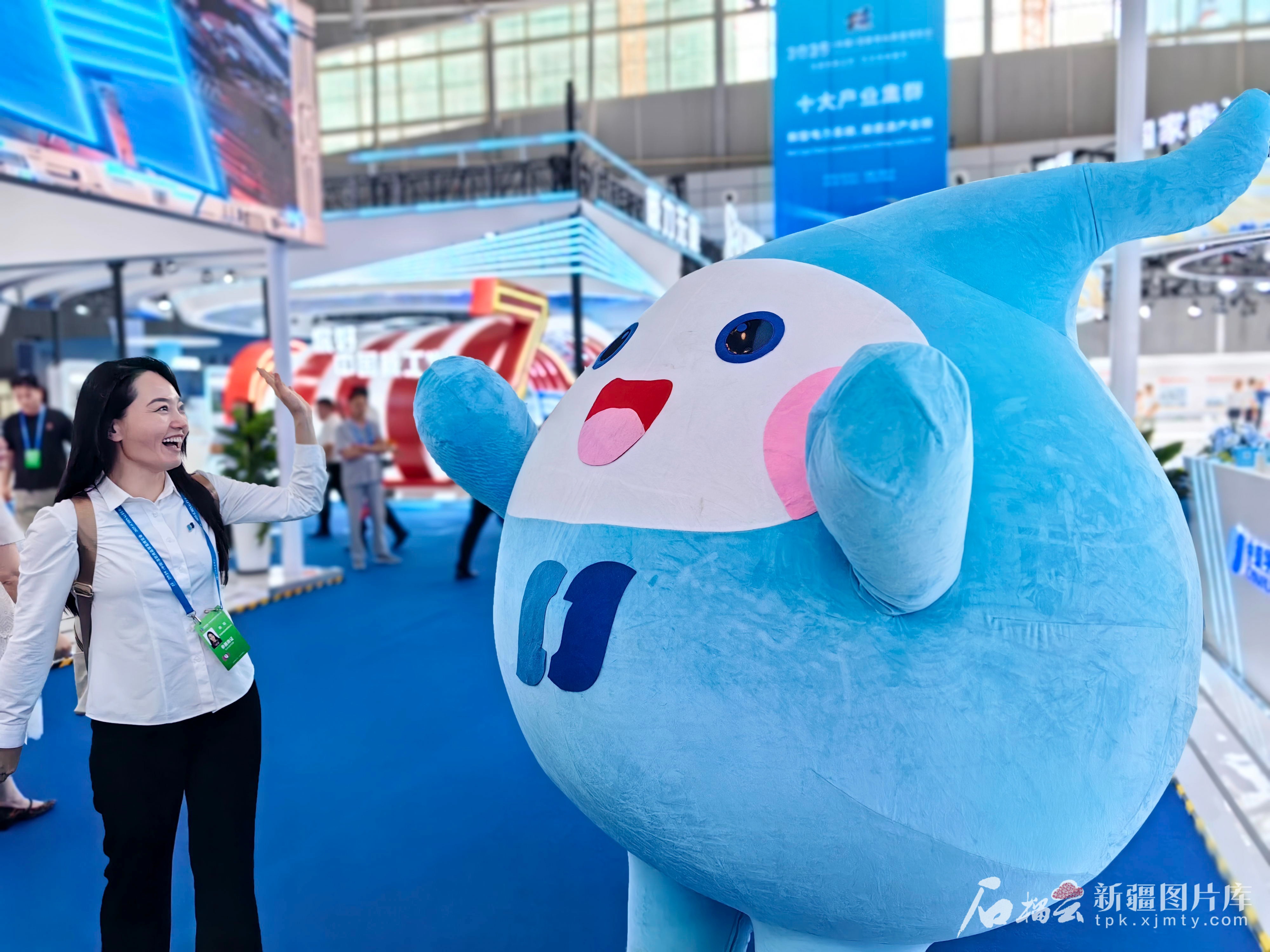 6月27日,參展商與“華小電”吉祥物互動。 天山網(wǎng)-新疆日報記者李雄心攝