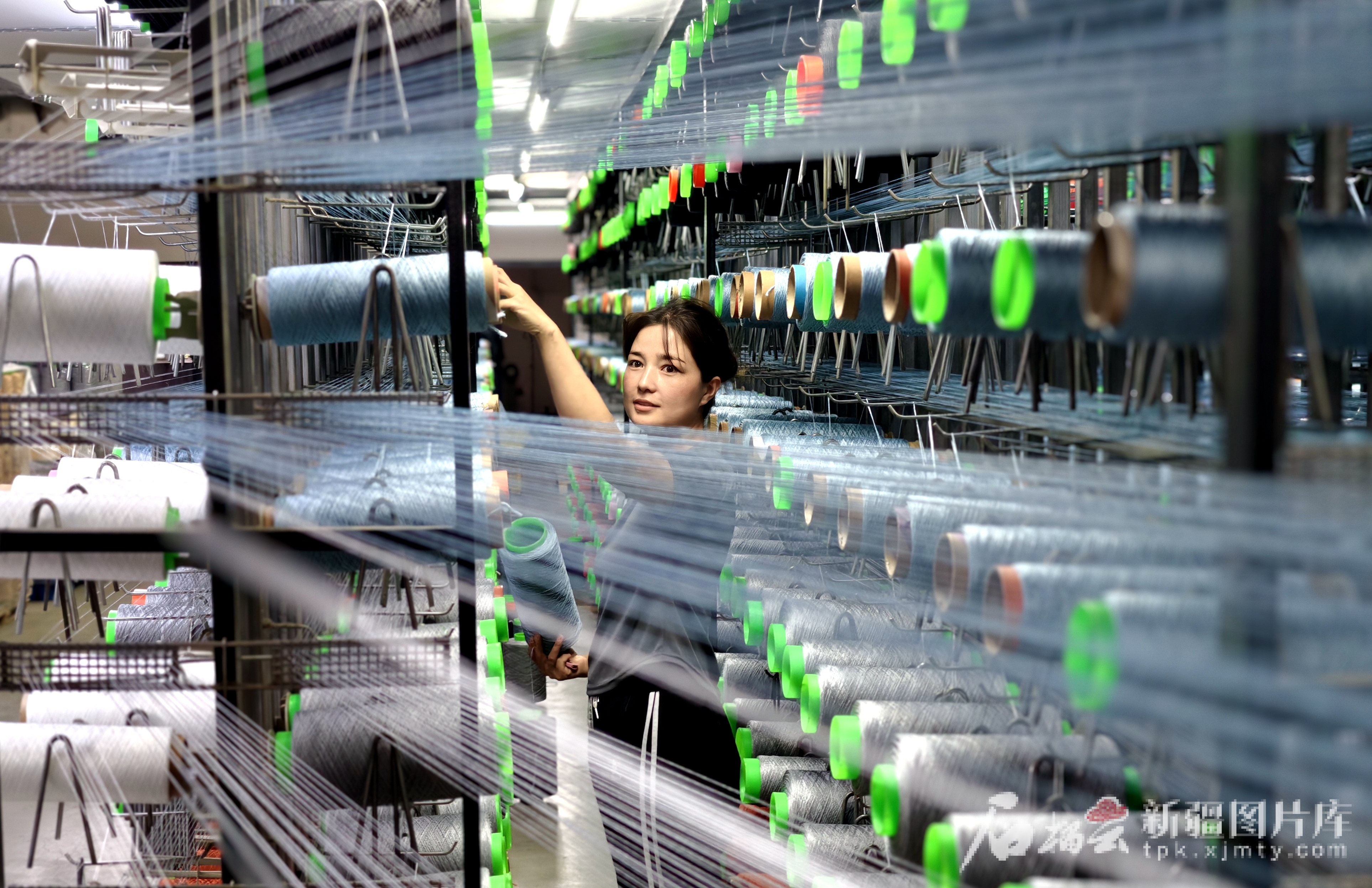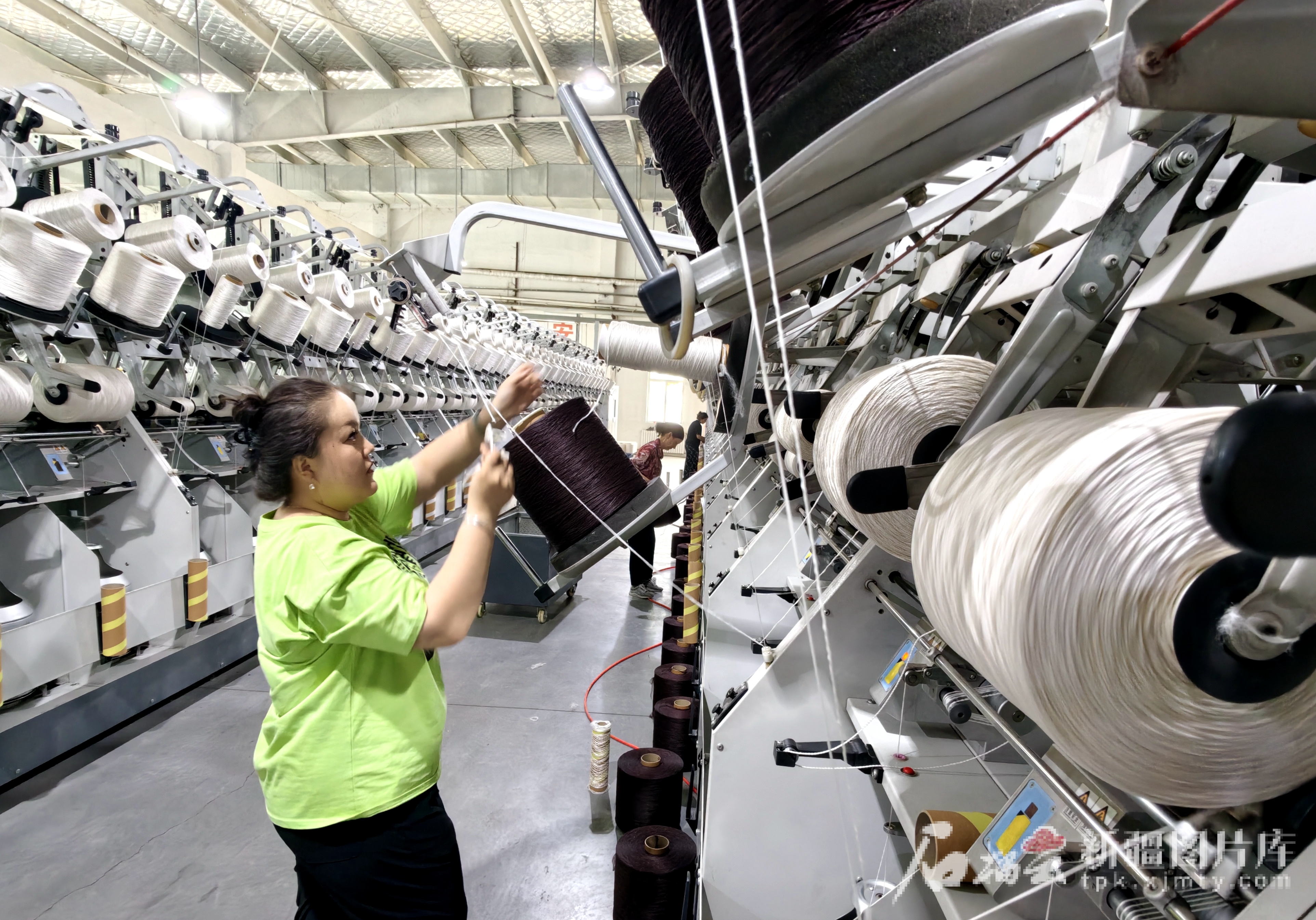 6月28日,工作人員在新疆天目湖地毯織造有限公司生產(chǎn)編織地毯的紡線。