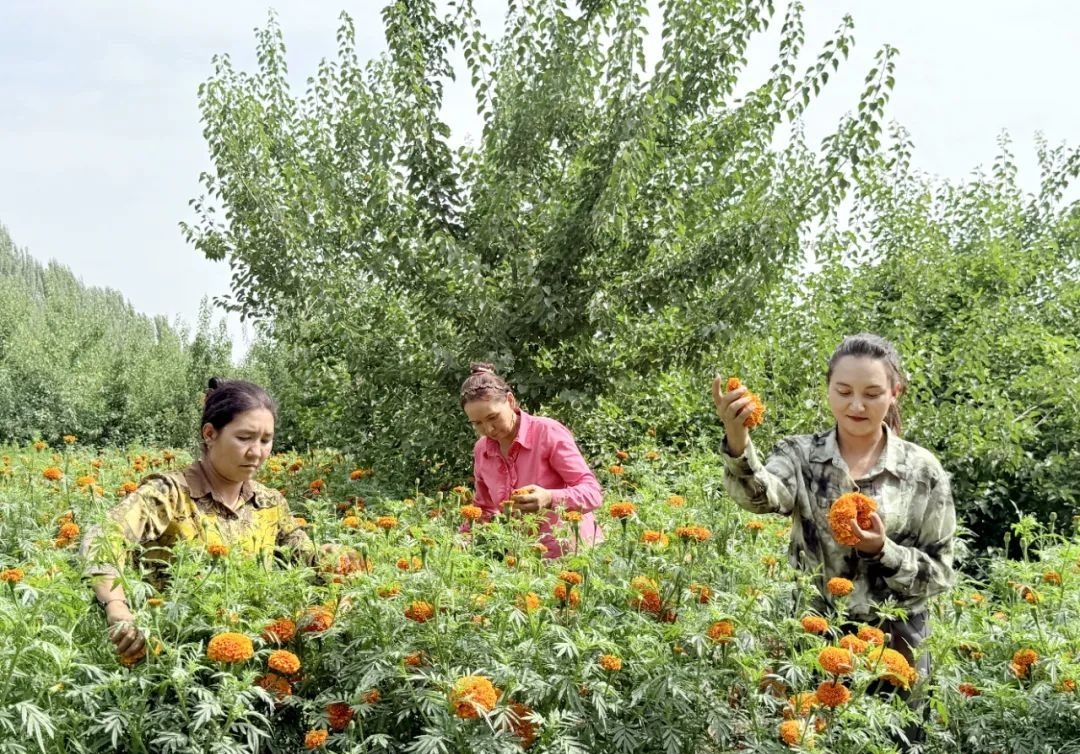6月28日,在英吉沙縣蘇蓋提鄉(xiāng)色日格拉村的萬壽菊地里,金黃的萬壽菊競(jìng)相綻放,宛如金色地毯鋪遍田間。近年來,蘇蓋提鄉(xiāng)積極探索特色產(chǎn)業(yè)發(fā)展道路,大力發(fā)展萬壽菊產(chǎn)業(yè),不僅扮靚了村莊,更拓寬了群眾增收致富的渠道。(英吉沙縣融媒體中心記者 張素瑋)