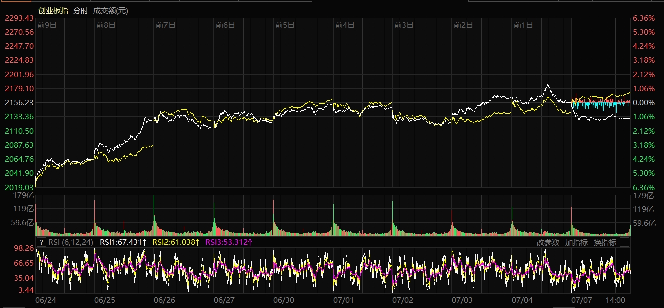 天山網(wǎng)-新疆日?qǐng)?bào)訊(記者趙悅報(bào)道)7月7日,A股三大指數(shù)走勢(shì)分化,滬指震蕩整理,創(chuàng)業(yè)板指走勢(shì)較弱。截至收盤,上證指數(shù)漲0.02%,報(bào)收3473.13點(diǎn);深證成指跌0.70%,報(bào)收10435.51點(diǎn);創(chuàng)業(yè)板指跌1.21%,報(bào)收2130.19點(diǎn)。滬深兩市成交額達(dá)12087億元,較上周五縮量2199億元。