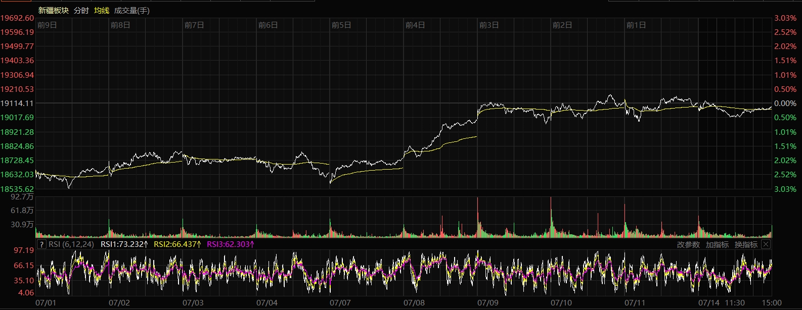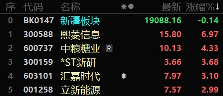 7月14日收盤(pán)時(shí),新疆板塊指數(shù)跌0.14%,報(bào)收19088.16點(diǎn),32只股票上漲,25只股票下跌,4只股票平盤(pán),上漲率52.46%,總換手率1.78%,總成交額146.55億元。