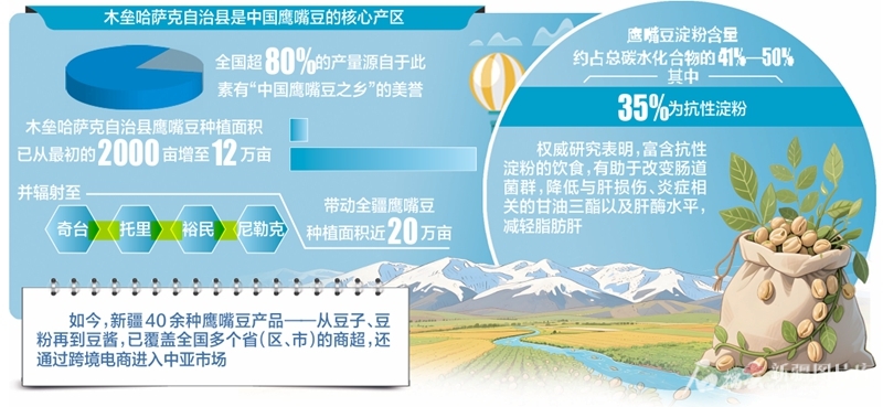 如今,新疆40余種鷹嘴豆產(chǎn)品——從豆子、豆粉再到豆醬,已覆蓋全國多個省(區(qū)、市)的商超,還通過跨境電商進入中亞市場,灶臺豆香飄向更廣闊天地。