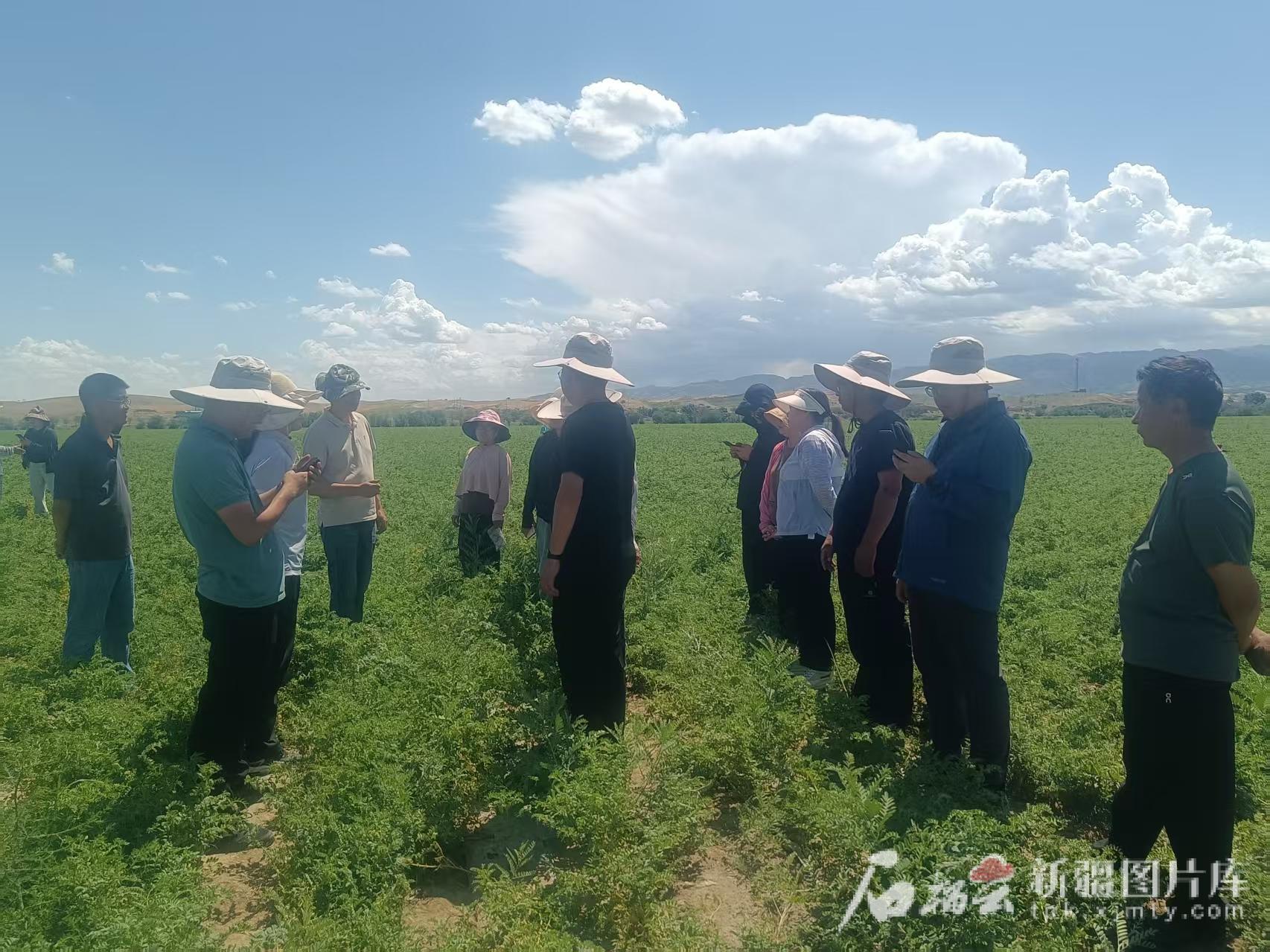 7月4日,國家食用豆產(chǎn)業(yè)技術體系專家在木壘哈薩克自治縣英格堡鄉(xiāng)月亮地村鷹嘴豆千畝示范田觀摩。圖/自治區(qū)農(nóng)科院提供