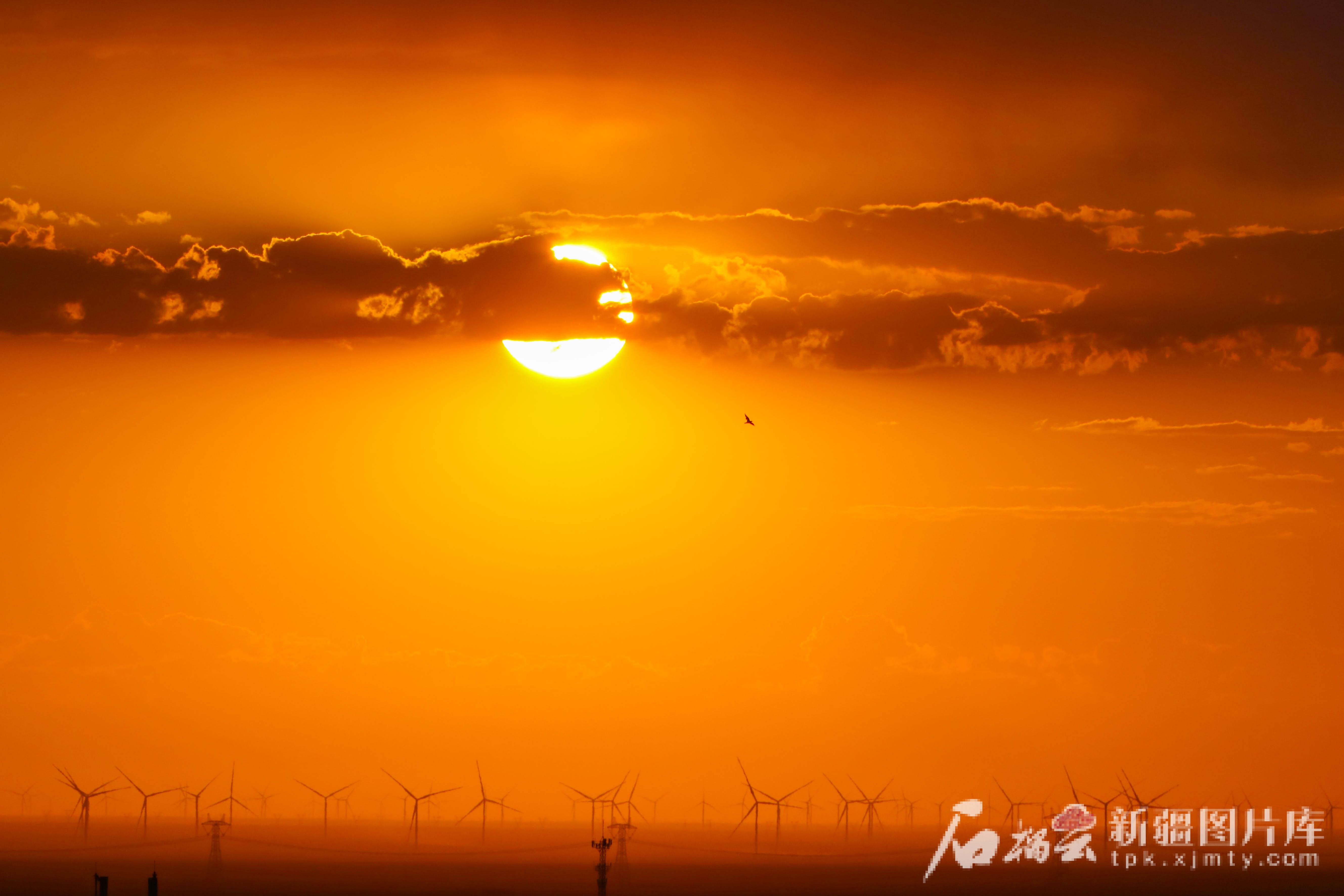 7月6日,朝陽映紅了天邊,木壘哈薩克自治縣東部的戈壁上風(fēng)力發(fā)電機組迎風(fēng)起舞。