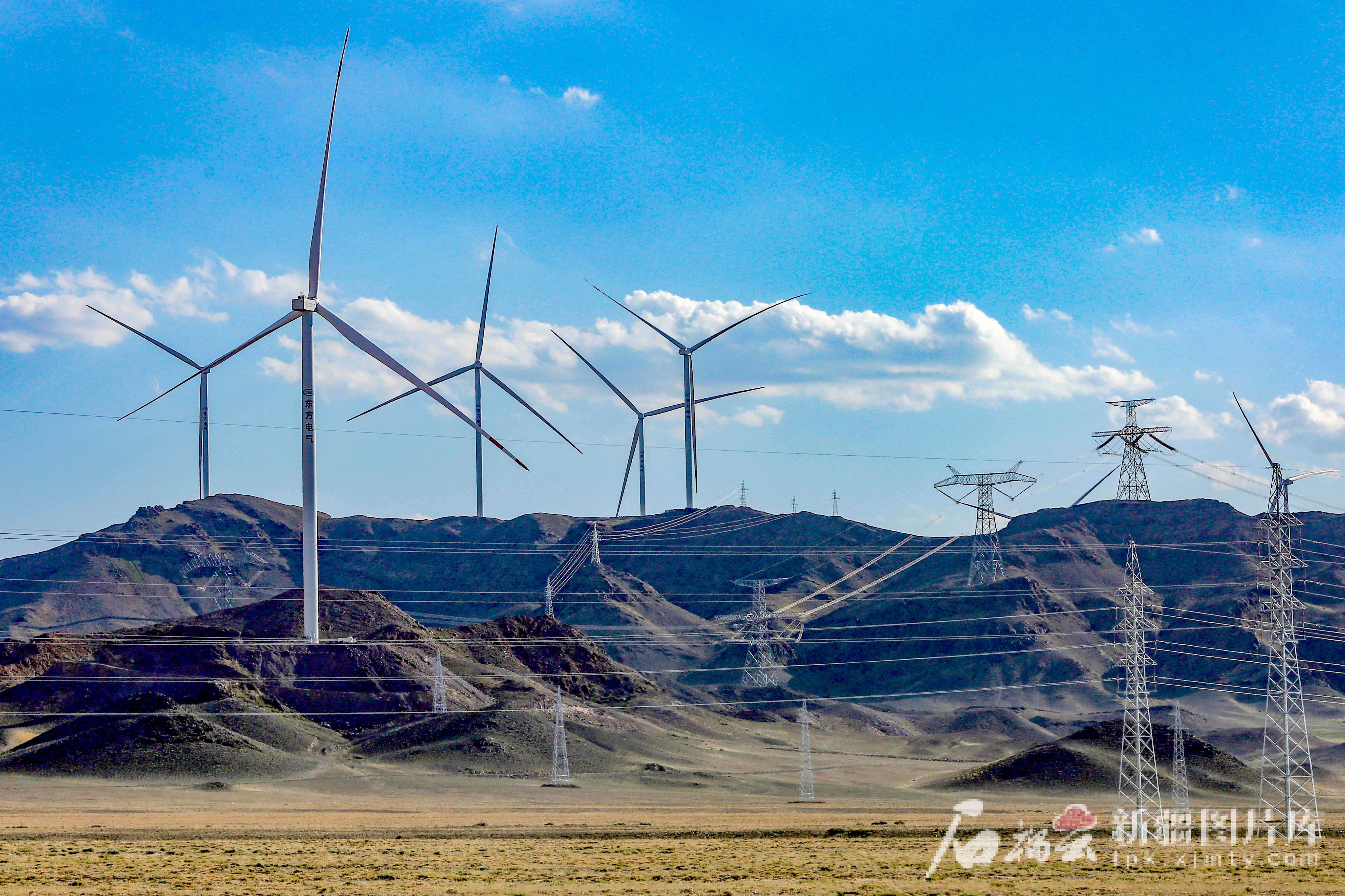 7月5日,在木壘哈薩克自治縣東部的戈壁上拍攝的東方電氣木壘100萬千瓦風(fēng)電場一角。