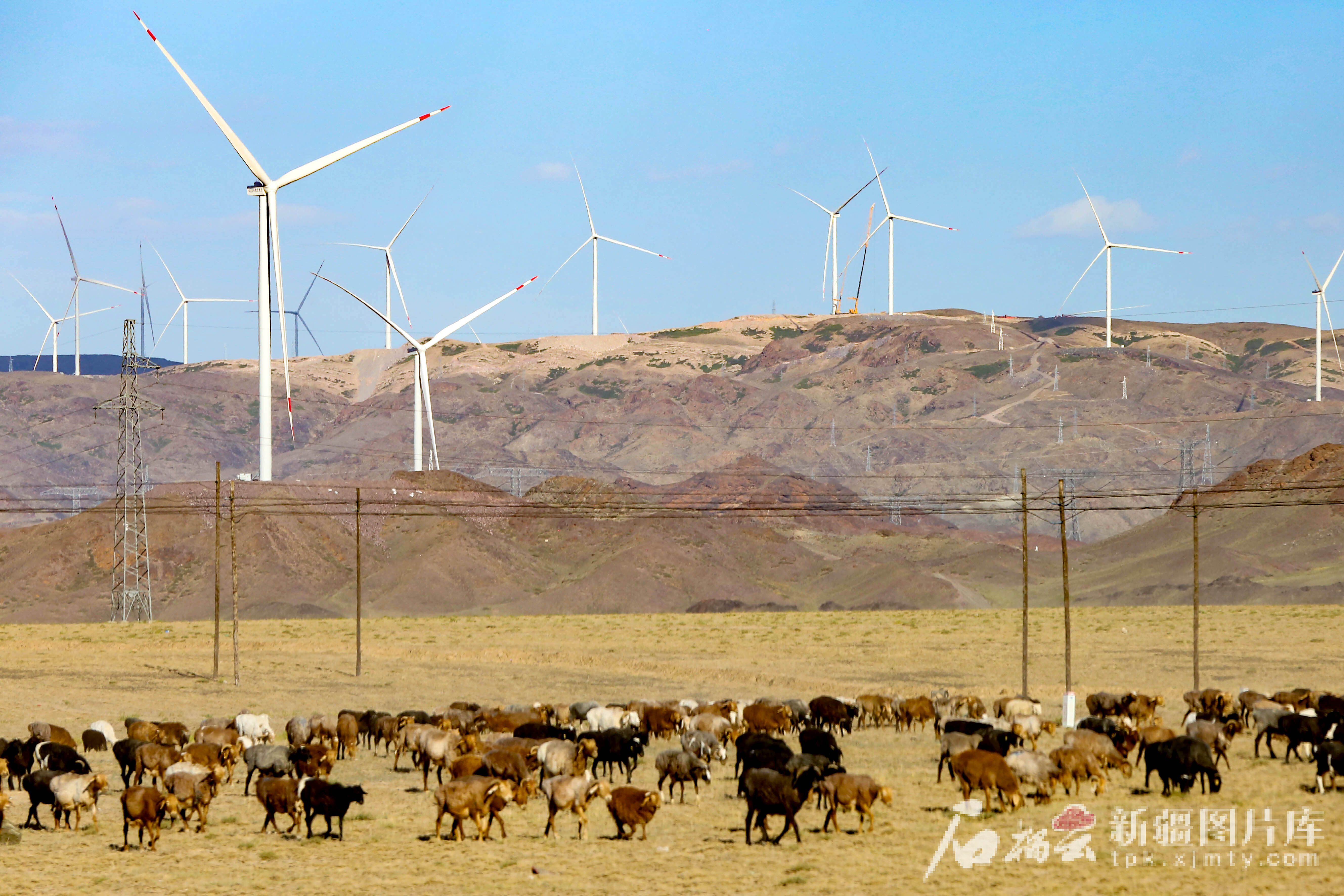 7月5日,羊群在東方電氣木壘100萬千瓦風(fēng)電場旁覓食。