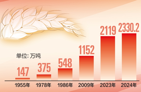 在歷史的維度中,腰站子村的發(fā)展與新疆重糧抓糧的努力同頻共振。自治區(qū)成立以來(lái),全區(qū)糧食總產(chǎn)穩(wěn)步提升。1986年總產(chǎn)突破500萬(wàn)噸,2009年突破1000萬(wàn)噸,2023年突破2000萬(wàn)噸。2024年,全區(qū)糧食產(chǎn)量2330.2萬(wàn)噸、種植面積4440萬(wàn)畝,分別居全國(guó)第13位、17位,分別比“十三五”末上升2位、3位,糧食連續(xù)7年實(shí)現(xiàn)增產(chǎn)。全年糧食單產(chǎn)524.8公斤/畝,歷史上首次躍居全國(guó)第一。2022年至2024年,全區(qū)糧食凈調(diào)出量累計(jì)達(dá)到1417萬(wàn)噸,成為全國(guó)7個(gè)糧食凈調(diào)出省份之一,糧食生產(chǎn)實(shí)現(xiàn)從人力到機(jī)械化再到智能化的演變,完成了從戈壁荒漠到西部糧倉(cāng)的蝶變。