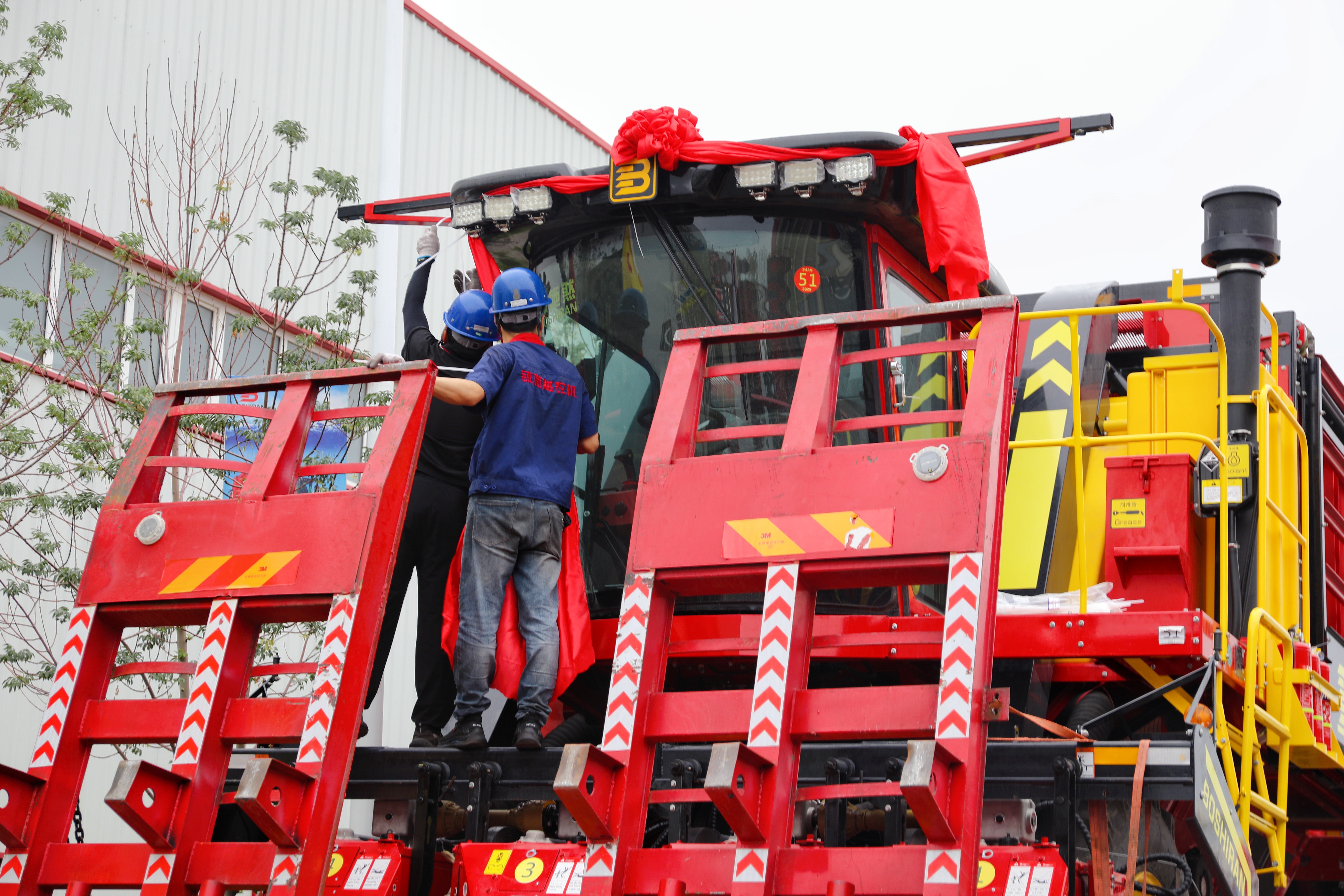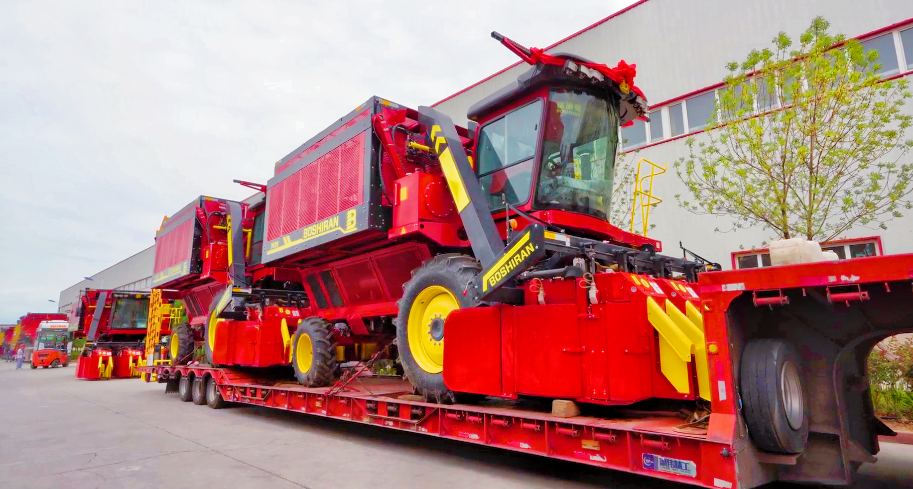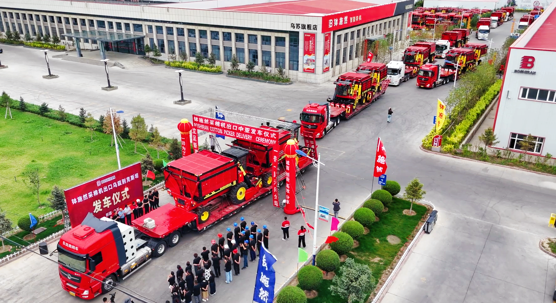 滿載采棉機(jī)的掛車從新疆缽施然智能農(nóng)機(jī)股份有限公司緩緩駛出