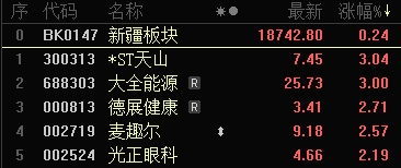 今日,*ST天山上漲3.04%,報(bào)收7.45元;大全能源上漲3.00%,報(bào)收25.73元;德展健康上漲2.71%,報(bào)收3.41元;麥趣爾上漲2.57%,報(bào)收9.18元;光正眼科上漲2.19%,報(bào)收4.66元。*ST新研、元道通信、*ST中基、八一鋼鐵、國(guó)統(tǒng)股份跌幅居前。