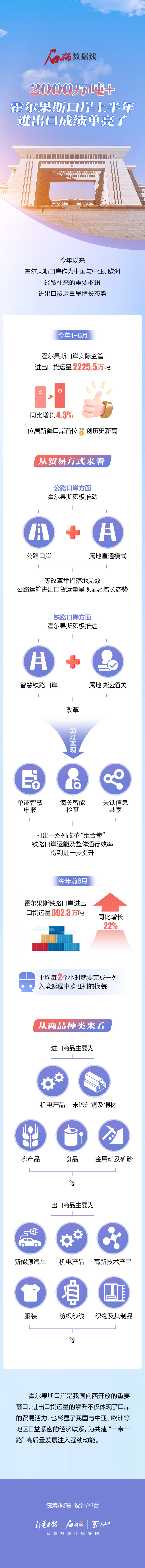 今年1-6月,霍爾果斯口岸實際監(jiān)管進(jìn)出口貨運量2225.5萬噸,同比增長4.3%,居新疆口岸首位,創(chuàng)歷史新高。