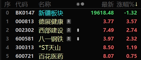 今日,德展健康上漲3.57%,報(bào)收3.77元;西部建設(shè)上漲2.74%,報(bào)收7.49元;八一鋼鐵上漲2.32%,報(bào)收3.97元;*ST天山上漲1.19%,報(bào)收8.50元;百花醫(yī)藥上漲0.75%,報(bào)收8.07元。*ST新研、天山股份、國(guó)統(tǒng)股份、新疆交建、青松建化跌幅居前。