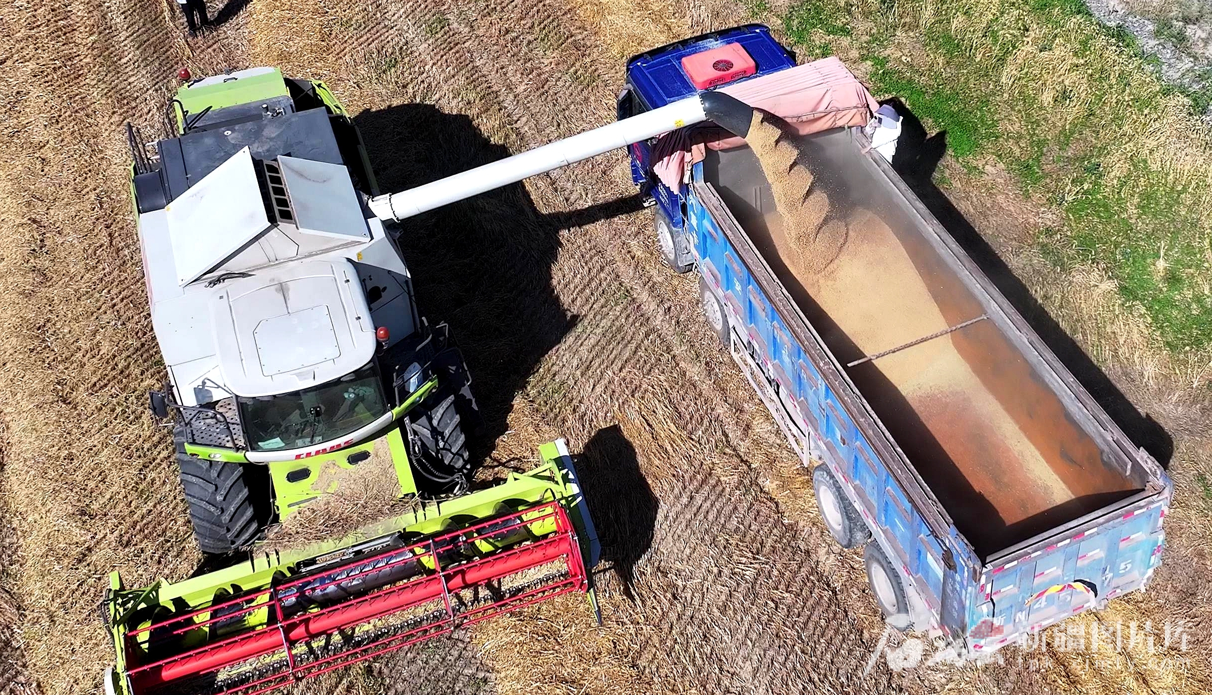 7月15日,在沙灣市東灣鎮(zhèn)的小麥地里,大型收割機(jī)在麥田里來(lái)回穿梭,將采收下來(lái)的麥粒裝上卡車運(yùn)往糧站。宋建亮攝
