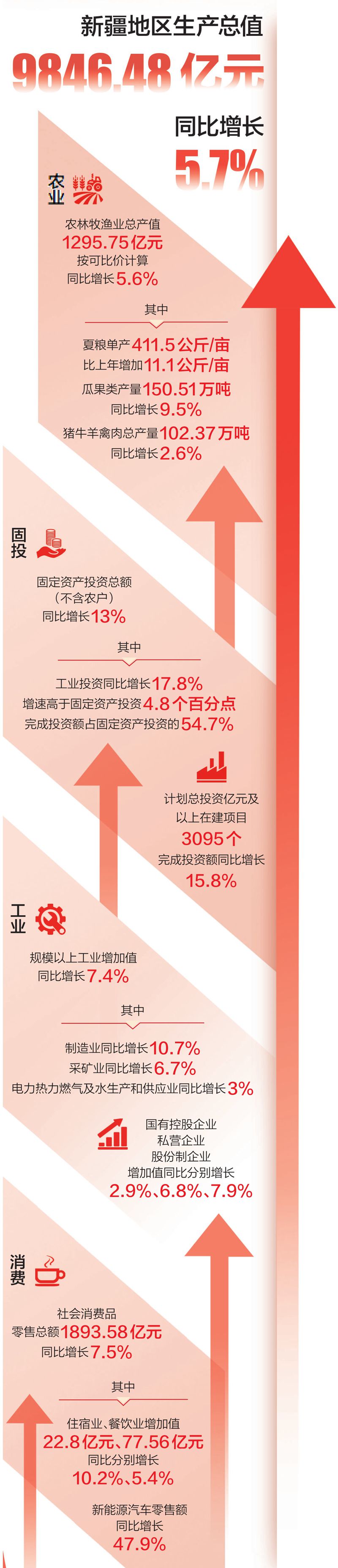 7月24日,上半年新疆經(jīng)濟(jì)答卷出爐:根據(jù)地區(qū)生產(chǎn)總值統(tǒng)一核算結(jié)果,上半年,新疆地區(qū)生產(chǎn)總值9846.48億元,按不變價(jià)格計(jì)算,同比增長(zhǎng)5.7%。